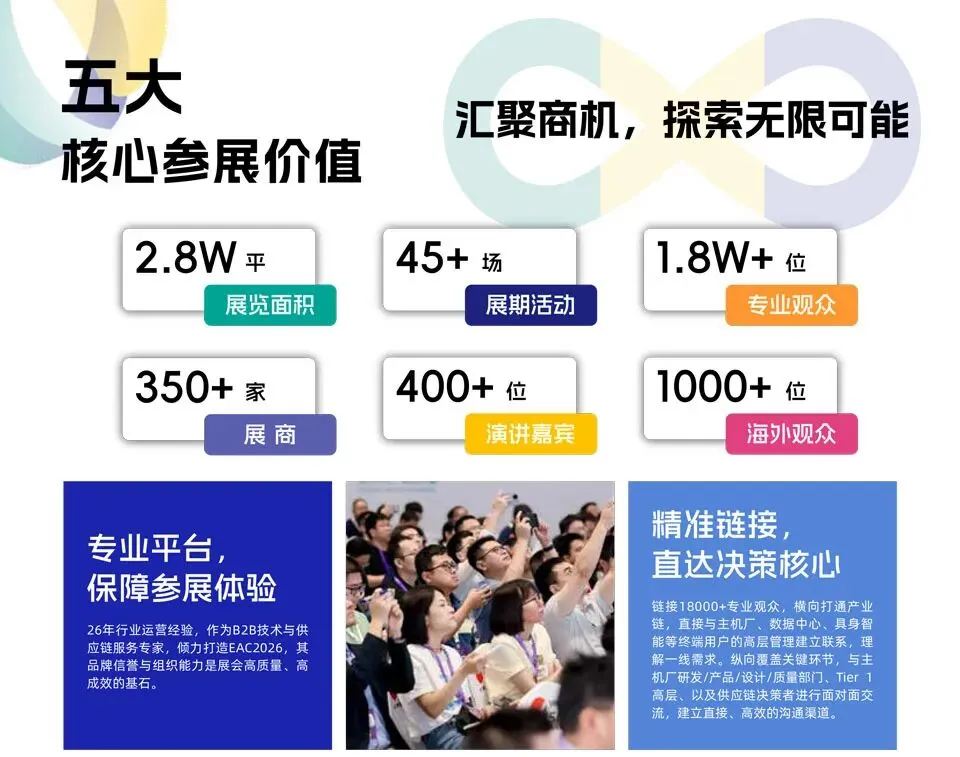 EAC2026将围绕热管理与液冷、内外饰与座舱、自动驾驶与具身智能三大板块,通过展览展示、专业论坛、闭门沙龙、奖项评选、产业考察等形式,多维呈现汽车、数据中心、AI芯片与机器人等产业前沿技术,推动AI驱动下的融合应用与生态构建,打造贯穿“车、算、机”三大核心领域的中国供应链秀场。