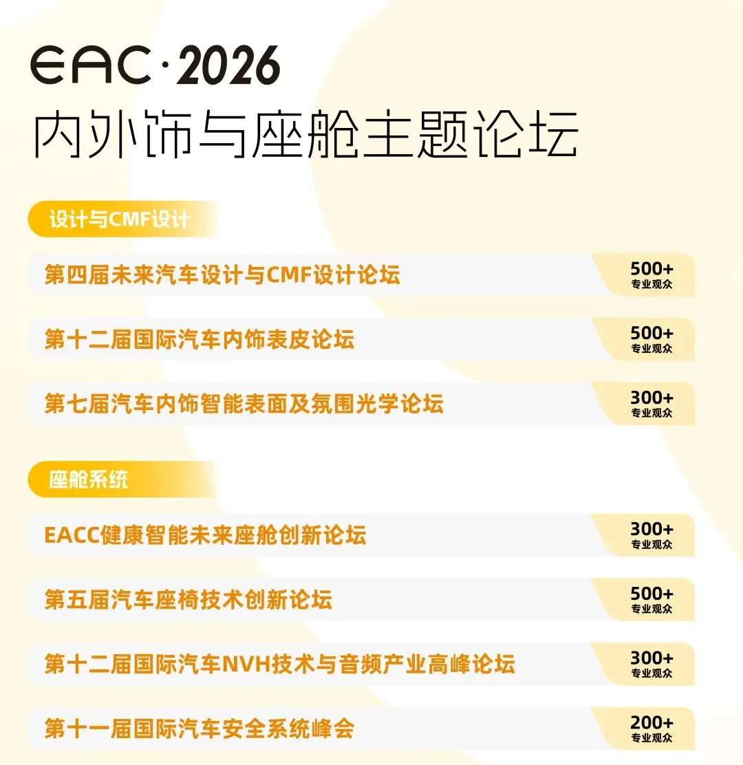 EAC2026 内外饰与座舱产业展览会,以 “AI 赋能・生态创新”为核心主题,将于2026 年 5 月 28-29 日在上海汽车会展中心盛大启幕。作为面向汽车产业的专业盛会,本届展会聚焦智能座舱、舱驾一体化、绿色轻量化材料与前沿 CMF 设计 ,精准链接汽车内外饰全产业链,打造集技术展示、趋势研讨与商贸对接于一体的高端平台。现场汇聚150 + 优质展商与180 + 行业领袖深度参与,全面呈现座舱域控、智能显示、HUD、环保新材料、创新工艺等尖端解决方案。同期配套8 大创新论坛、闭门沙龙及产业对接会,从设计趋势到技术落地,从供应链匹配到市场机遇,一站式解锁汽车内外饰与座舱产业的未来图景。