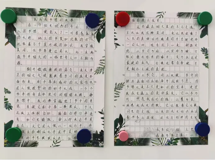 “图书馆是安静的,像一座装满秘密的森林。”“它是知识的海洋,也是梦想启航的地方。”“在我心情不好的时候,图书馆像一个知心的朋友,默默陪着我……”一行行工整的字迹,一句句真诚的感悟。孩子们把图书馆比作朋友、老师、港湾……文字或许稚嫩,却字字发自内心。读着读着,你会想起自己与图书馆的第一次相遇。