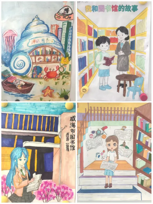 书如梯子,直通云端——有孩子画下这样的画面:一级级书本堆叠成天梯,通向星光灿烂的阅读城堡。有“海底图书馆”:珊瑚作书架,鱼儿围坐听故事,潜水员小朋友正捧着一本大大的海洋百科。当然,也少不了孩子们笔下的威海市图书馆——熟悉的建筑轮廓,被添上彩虹色的窗户和会微笑的门廊。每一幅画,都是孩子们心中图书馆最美好的模样。