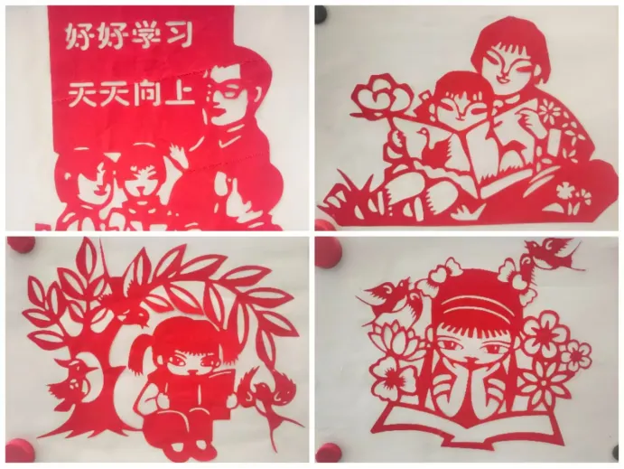 一把剪刀,一张红纸,孩子们剪出了栩栩如生的小象,也剪出了“好好学习,天天向上”的稚嫩誓言。看,小女孩在树荫下静静读书,小鸟停在枝头陪伴她——树荫是天然的书房,鸟鸣是阅读的伴奏。红色的剪纸热烈喜庆,白色的留白像一页未写完的诗。整幅作品就像一首无声的童谣,轻轻说着:“阅读与自然相伴,童真与美好共生。”在孩子们手中,剪纸不仅是手艺,更是他们送给图书馆的一份温暖礼物。