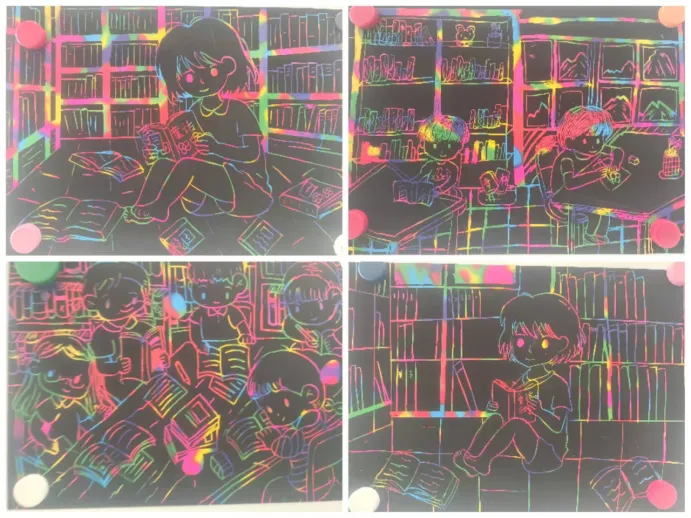 黑色刮画纸下,藏着怎样的惊喜?孩子们用竹笔轻轻刮擦,图书馆的轮廓便从黑暗中浮现——有的刮出星空下安静的阅读角,有的刮出书本堆叠成的城堡。每一道刮痕都是探索的痕迹,仿佛在说:图书馆就像那层神秘的黑色,只要你愿意动手“发现”,里面便有无尽的光亮。