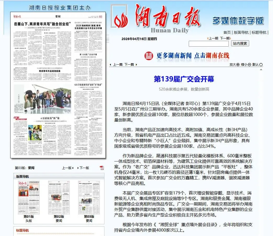 盛会启幕,万商云集!第139届广交会于4月15日—5月5日在广州分三期举办,作为“十五五”开局之年的全球贸易盛宴,再次见证中国智造的强大吸引力。本届展会湖南交易团强势出击,参展企业超520家,展位突破1000个,长沙企业参展数量亦创历史新高,以“满格”姿态抢占全球市场高地。