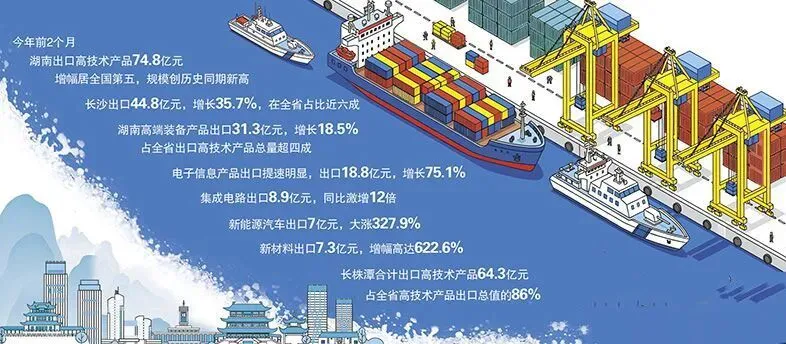 当前长沙外贸正全面迈向新3H时代,1—2月全市出口高技术产品44.8亿元,同比增长35.7%,3H产品已成为拉动高技术、高附加值产品出口的核心增长极。