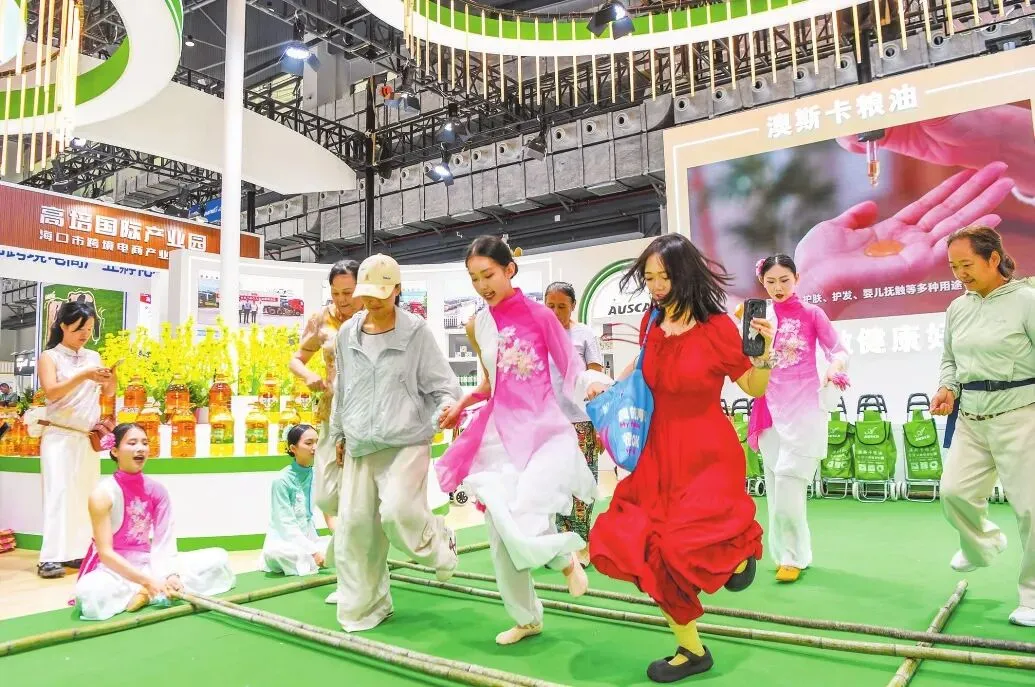 在第六届消博会现场,市民游客体验竹竿舞。记者 康登淋 摄