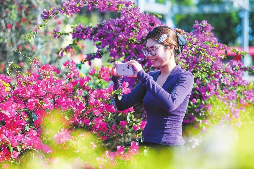 琼山区红旗镇三角梅共享农庄里,姹紫嫣红的三角梅花开正艳,吸引市民游客前来拍照打卡。记者 苏弼坤 摄