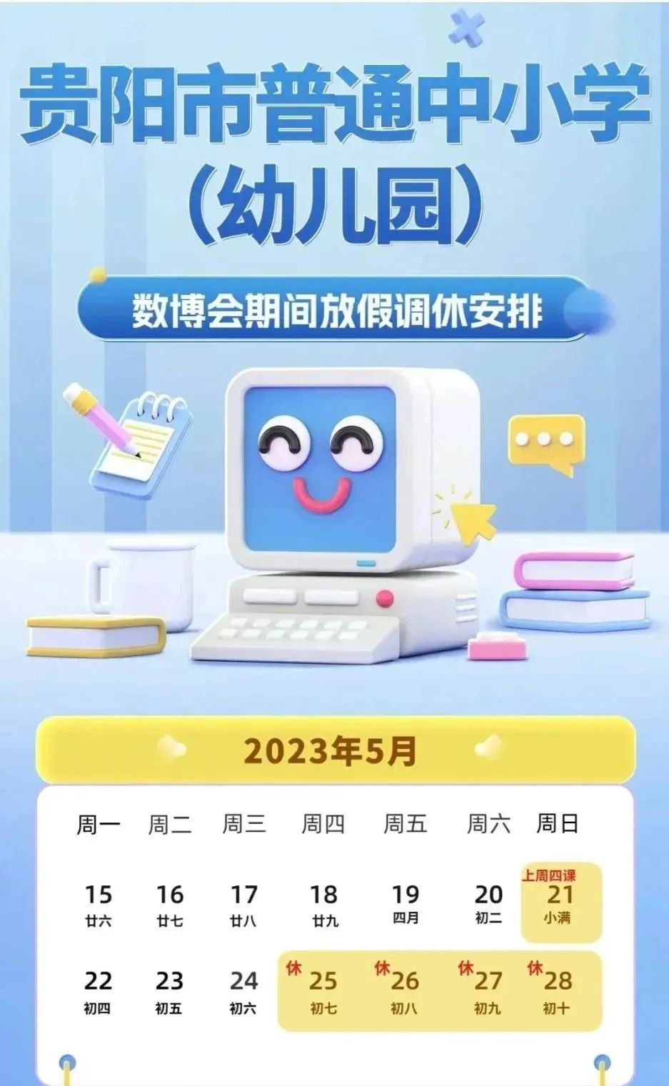 接市教育局《关于2023年中国国际大数据产业博览会期间全市普通中小学(幼儿园)放假调休的通知》。为确保2023年中国国际大数据产业博览会(以下简称“数博会”)期间各项活动顺利进行,按照市委、市政府对部分区域实行放假调休的安排,现将我校放假调休事宜安排如下:
