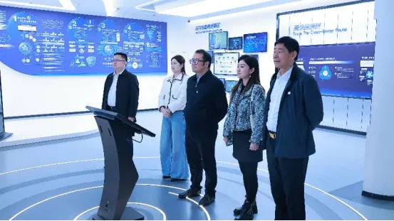 调研组首先参观了国程公司办公环境及平台运营中心,详细了解了公司发展历程、核心业务布局及未来战略规划。袁华董事长向来访领导重点介绍了公司自主开发和运营的“湖南省跨境贸易综合服务平台” ——这是全国首个基于自主可控区块链底层技术构建的省级跨境贸易综合服务平台,可实现跨境贸易全流程一站式数字化管理。该平台的核心优势在于以自主可控区块链技术为底座,打通海关、税务、外汇、商务、人民银行等部门的数据壁垒,构建起“关、税、汇、融、商、物、仓、证”八大生态服务体系。作为国家17部委联合认定的“区块链+贸易金融”试点项目核心承载主体,平台已接入中国(长沙)国际贸易“单一窗口”,并在近期完成了首笔人民币与尼日利亚奈拉本币结算,在中非经贸跨境结算领域取得突破性进展。
