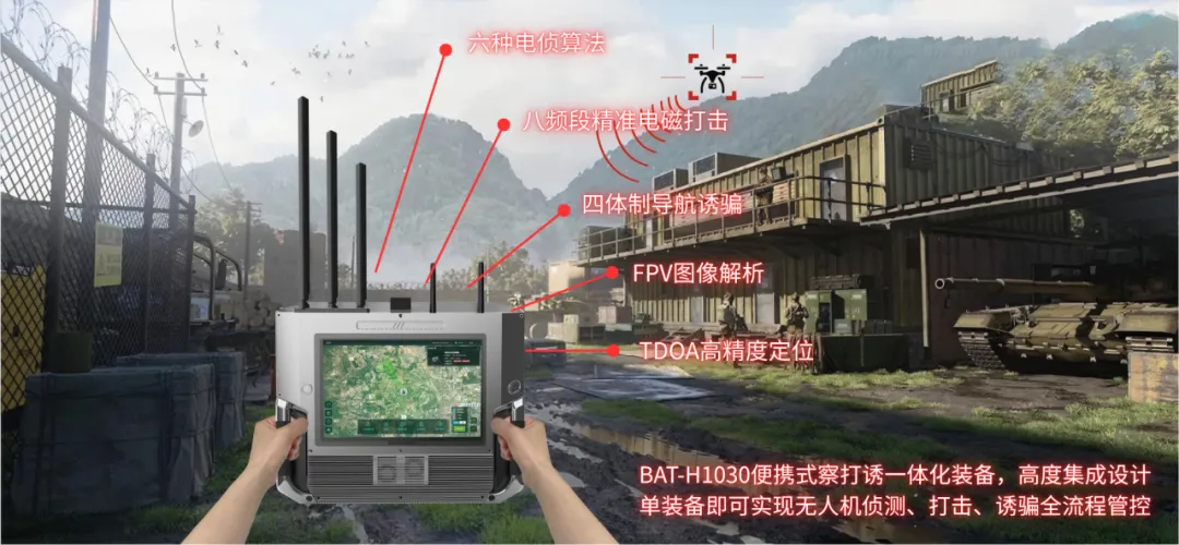 BAT-H1030便携式察打诱反无装备,单台即可实现无人机侦测、诱骗、打击的全流程管控。外观脱敏设计、五种使用方法(手持、背负、支架架设、云台、车载吸附),适合在复杂场景下对管控目标进行快速指向与多策略处理。