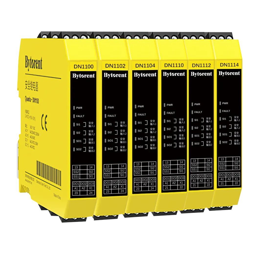 DN1100系列属于功能型安全继电器,该系列多型号可选,可用于监视各种安全部件,比如急停、门锁、触边等,还可形成一个设备功能系统以外的,独立的安全监控系统。