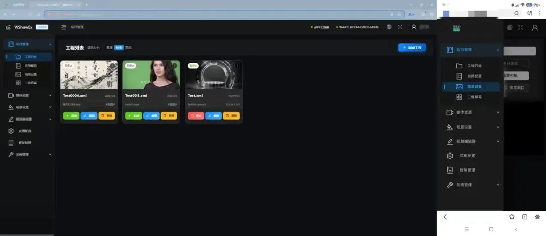 ViShowEx 突破设备与系统限制,实现Windows/Linux/ 安卓 /iOS/ 鸿蒙五大平台全兼容,手机、平板、电脑多终端均可完成项目管理、参数调节、场景切换、机位控制等操作,多端数据实时同步,支持移动端远程控制、多终端协同作业,让创作与播控不受空间与设备约束。同时系统兼容 gRPC/UDP/TCP 等多种通信协议,基于 WebRTC 实现低延迟视频传输,可轻松对接第三方系统,满足设备联动、远程控制等复杂业务需求,真正实现 “一个系统,全平台运行”。