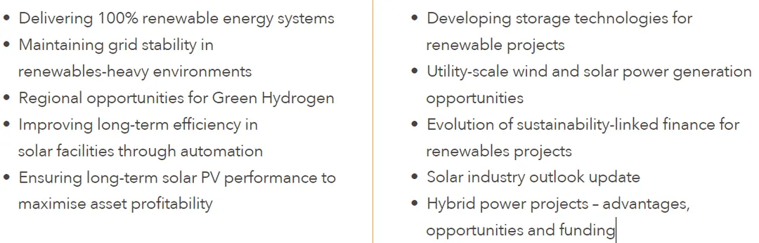 太阳能与清洁能源论坛是重要的知识交流平台,业界领袖聚焦在这里讨论推动本地区与世界可再生能源发展的挑战、技术与创新举措。该论坛讨论了能够满足能源期望的策略,尤其在城市地区以及有助于实现这些目标的最新技术。该论坛讨论的内容包括如下: