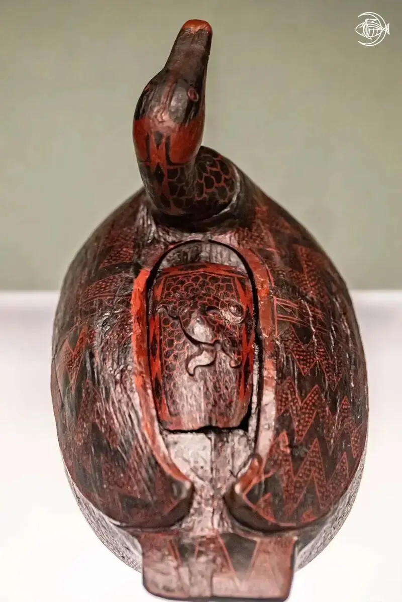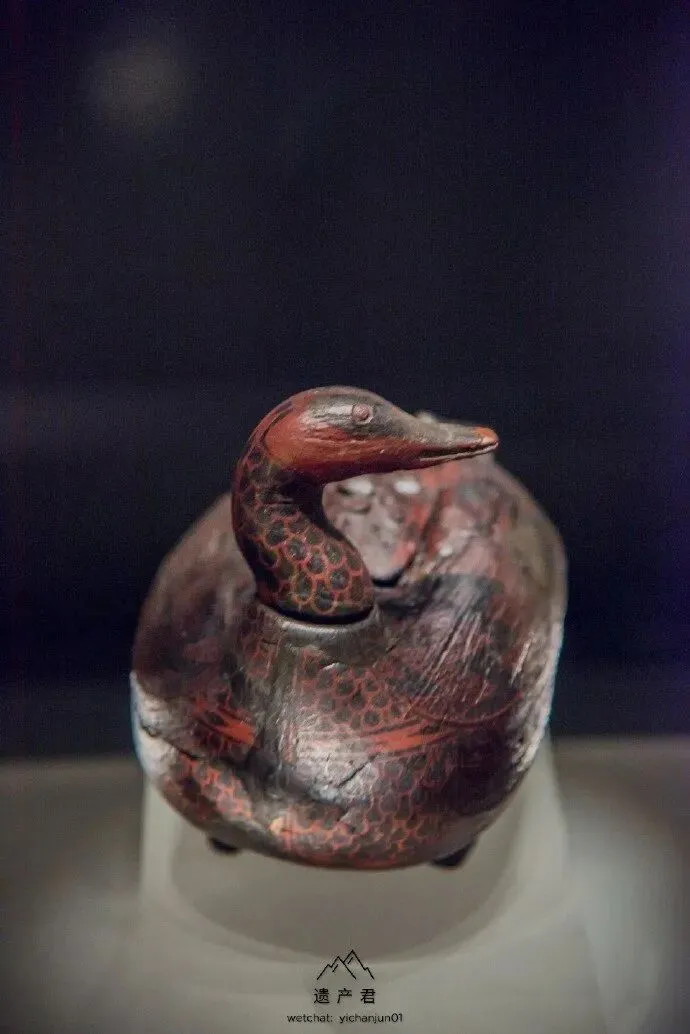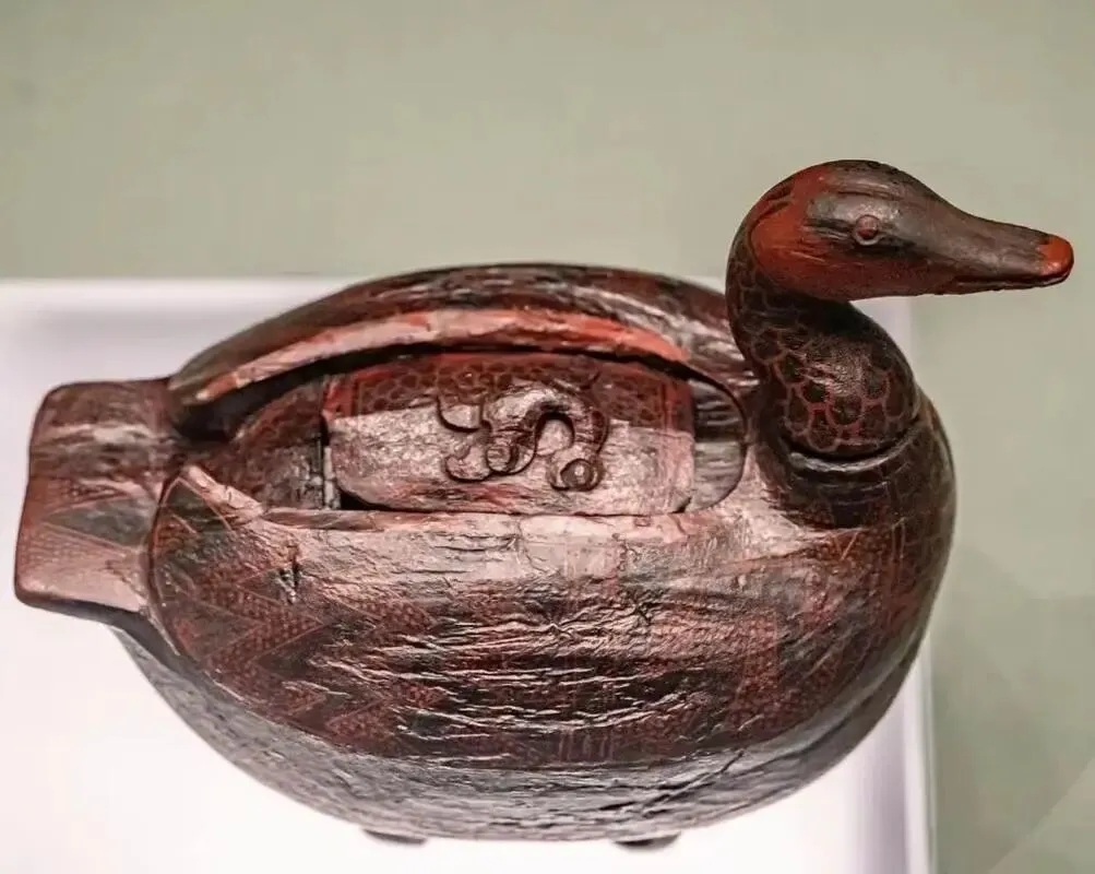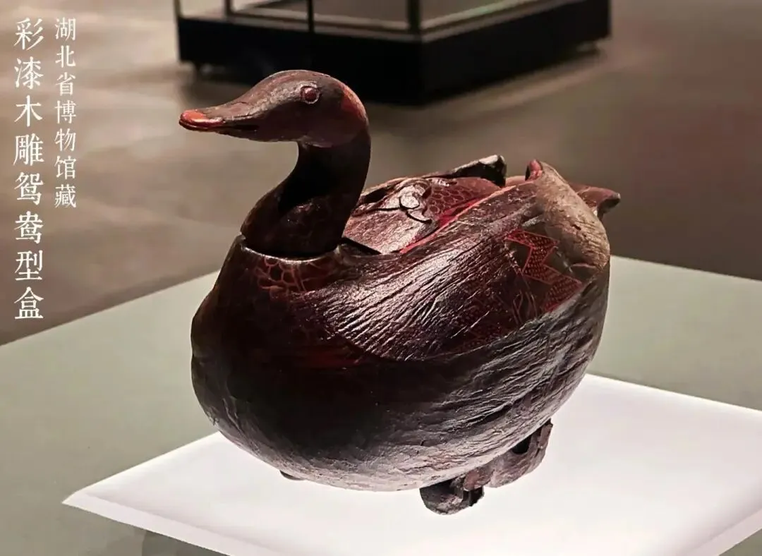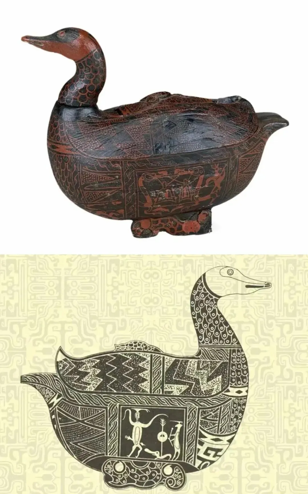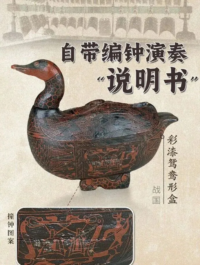 考古学家据此推测,这件精美的漆盒很可能属于二号陪葬棺中的女性殉葬者。她可能曾是曾侯乙的宠妃、侍女或近身侍从,生前或许掌管礼乐或负责妆饰,因此随葬品中出现了这件兼具实用与象征意义的器物。漆盒造型为鸳鸯,寓意忠贞与陪伴,其可转动的头部仿佛“回眸顾盼”,似有不舍尘世之意,或许正寄托了墓主人生前的情感羁绊。虽然她并非墓葬的主棺主人,但能以如此珍贵的国宝级器物随葬,足见其地位不凡。漆盒腹部绘有“撞钟击磬”与“击鼓舞蹈”场景,不仅反映她可能与宫廷乐舞有关,也暗示其身份与礼乐仪式的联系,甚至可能是主持或参与祭祀的女性巫师(巫觋文化中女性亦可为巫)。因此,这件漆盒的主人极可能是一位身份特殊的女性殉葬者,她与曾侯乙关系密切,生前或执掌妆奁、参与礼乐,死后以这件“会说话”的文物相伴,成为两千多年后我们窥见战国贵族生活与精神世界的一扇窗。