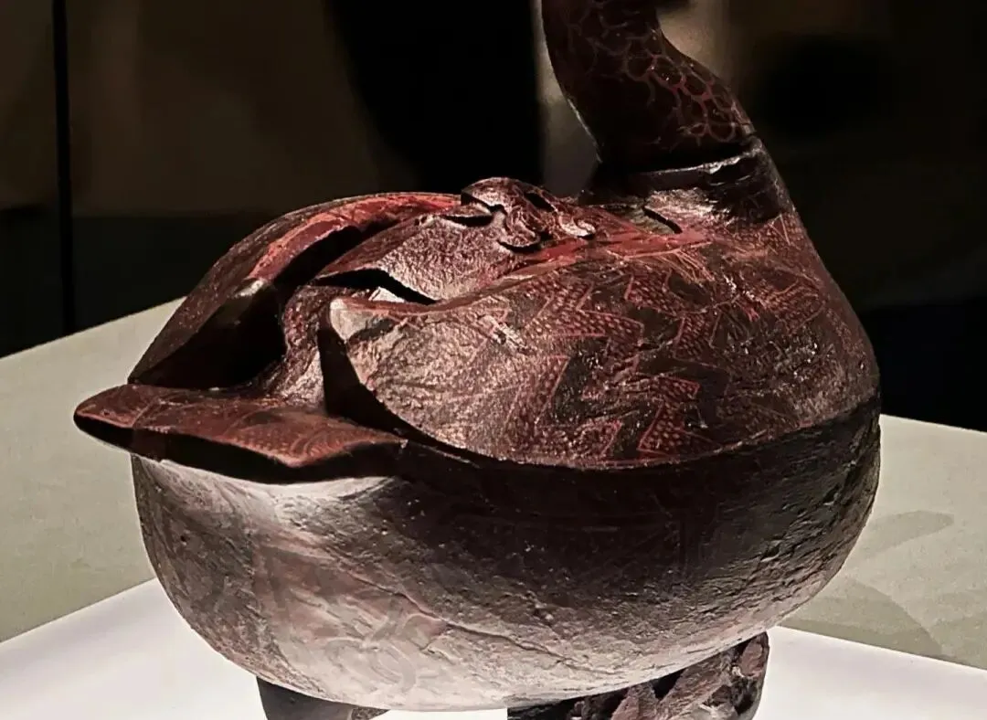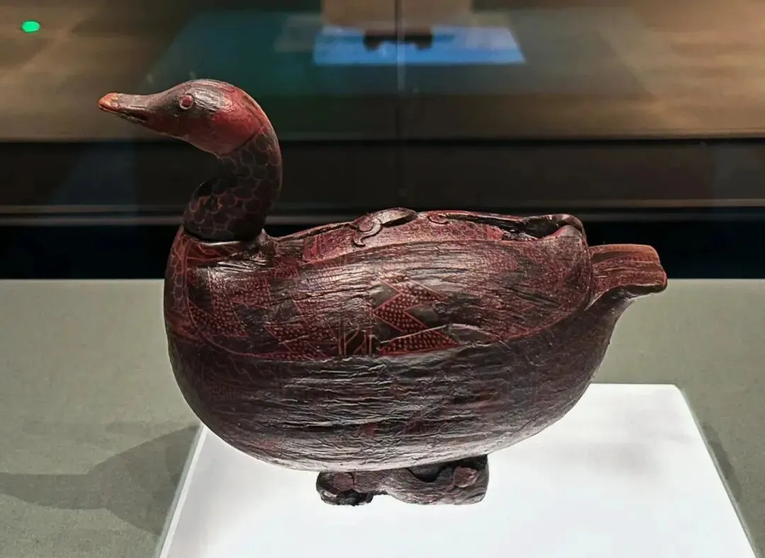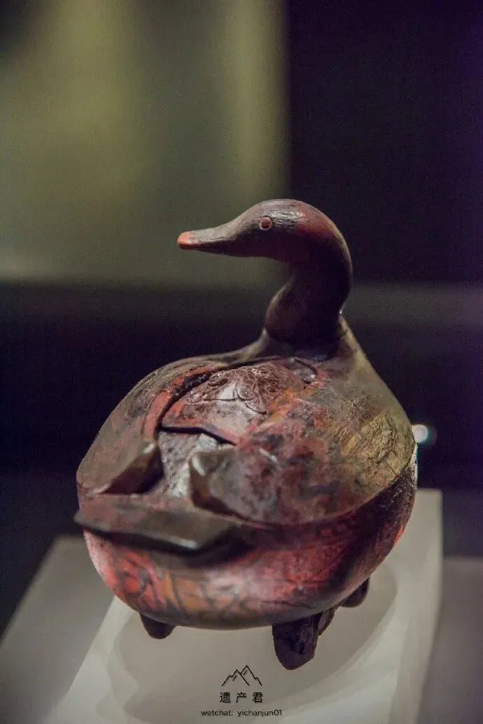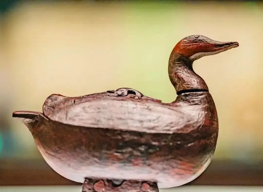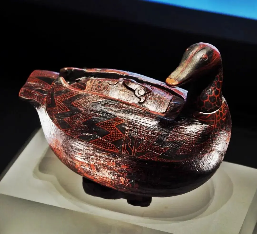 考古学家据此推测,这件精美的漆盒很可能属于二号陪葬棺中的女性殉葬者。她可能曾是曾侯乙的宠妃、侍女或近身侍从,生前或许掌管礼乐或负责妆饰,因此随葬品中出现了这件兼具实用与象征意义的器物。漆盒造型为鸳鸯,寓意忠贞与陪伴,其可转动的头部仿佛“回眸顾盼”,似有不舍尘世之意,或许正寄托了墓主人生前的情感羁绊。虽然她并非墓葬的主棺主人,但能以如此珍贵的国宝级器物随葬,足见其地位不凡。漆盒腹部绘有“撞钟击磬”与“击鼓舞蹈”场景,不仅反映她可能与宫廷乐舞有关,也暗示其身份与礼乐仪式的联系,甚至可能是主持或参与祭祀的女性巫师(巫觋文化中女性亦可为巫)。因此,这件漆盒的主人极可能是一位身份特殊的女性殉葬者,她与曾侯乙关系密切,生前或执掌妆奁、参与礼乐,死后以这件“会说话”的文物相伴,成为两千多年后我们窥见战国贵族生活与精神世界的一扇窗。