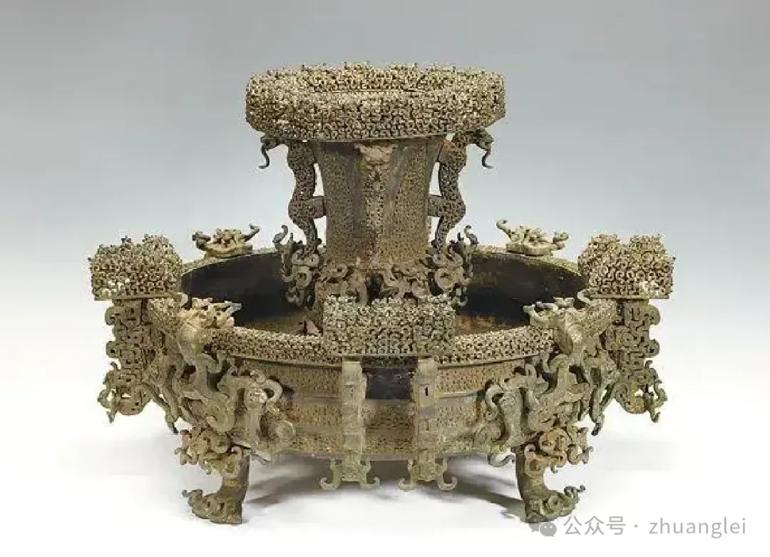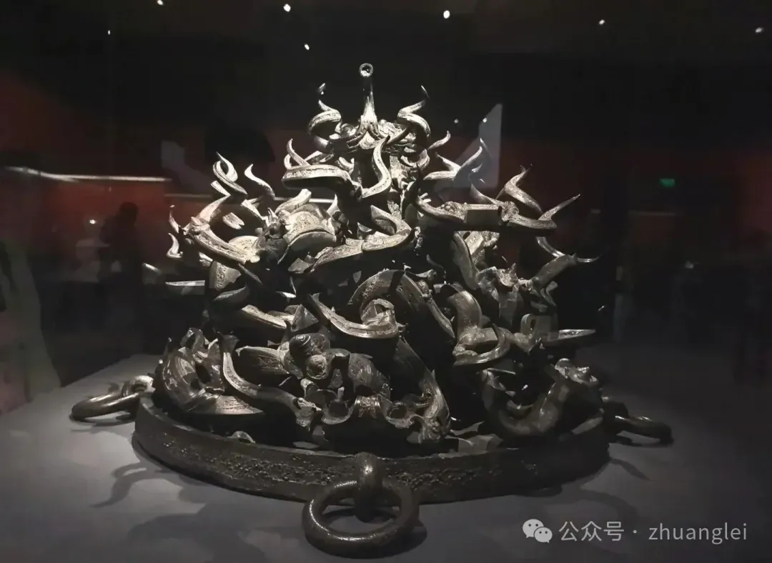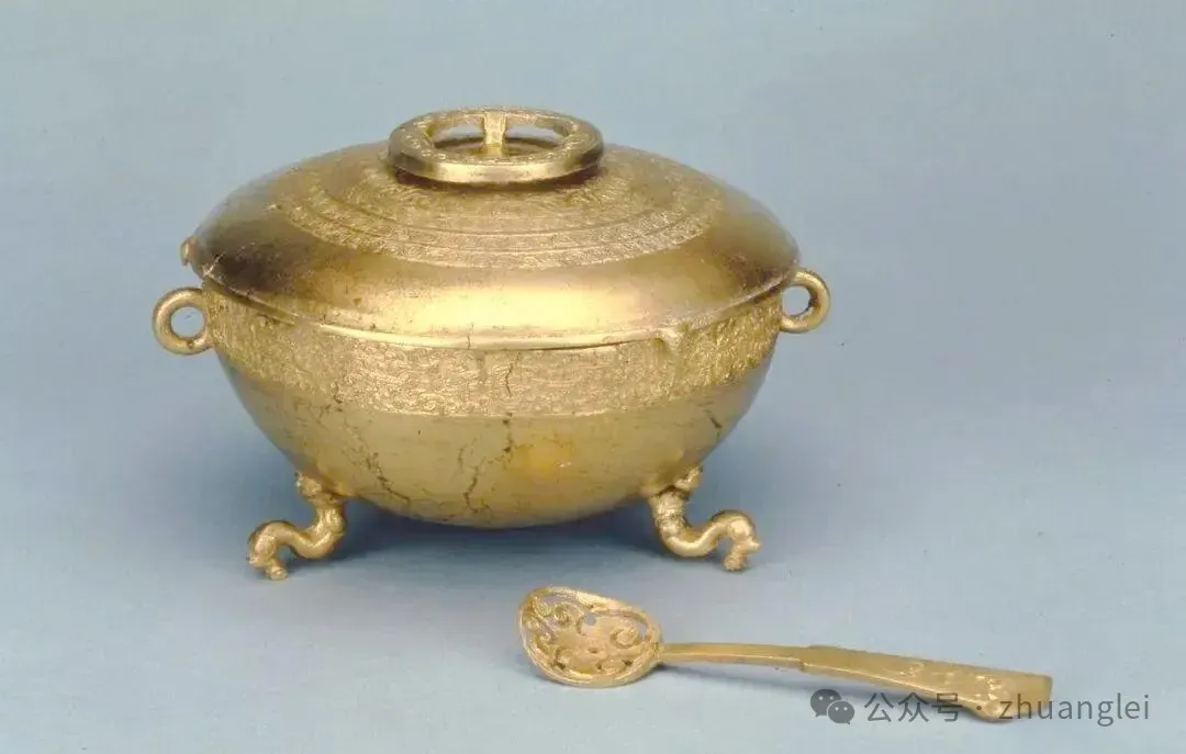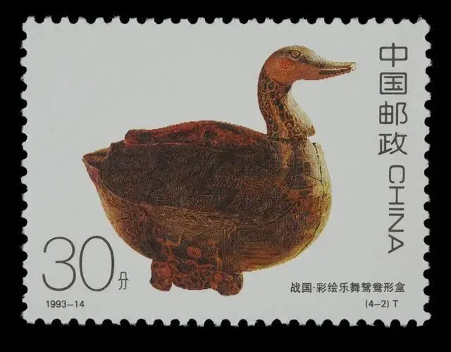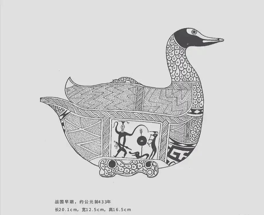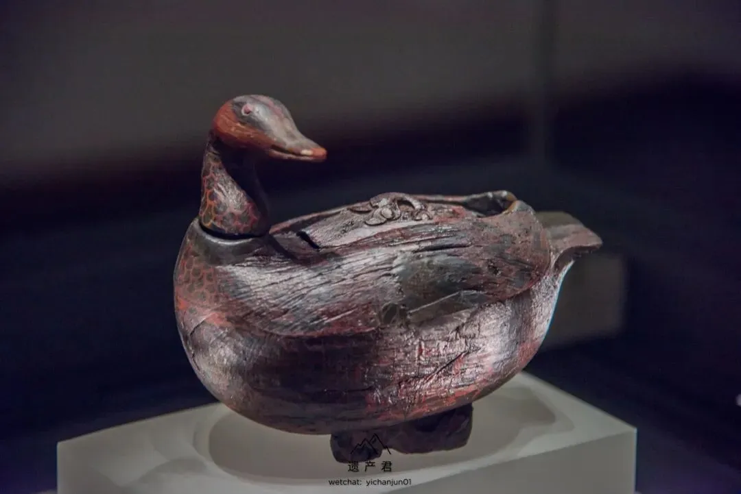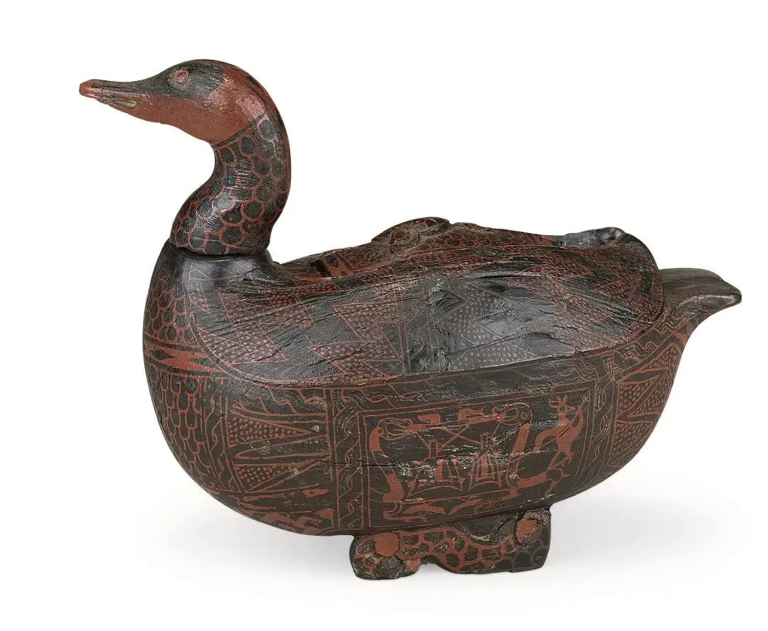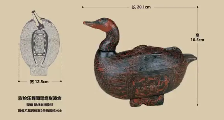 战国彩绘乐舞图鸳鸯形漆盒于1978年出土于湖北随州市擂鼓墩的曾侯乙墓,是该墓发掘时出土的第一件文物,发现时正漂浮在西室的水面上,宛如一只活生生的鸳鸯,形态栩栩如生,极具视觉冲击力。其出土位置为墓葬的西室,而它的头部则在稍后于西室的二号陪葬棺内被发现。这一特殊埋藏方式暗示了它与棺内女性殉葬者之间可能存在密切关联。考古学者据此推测,这位女子可能是曾侯乙的宠妃或侍女,而这件精美的漆盒或许是她生前使用的化妆盒,随葬于墓中,寄托了生死相随的情感寓意。