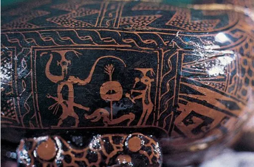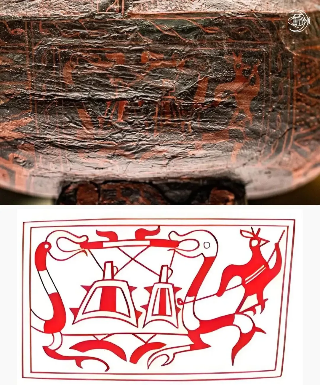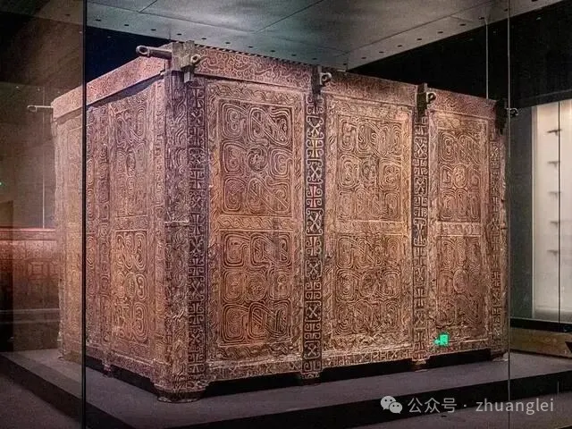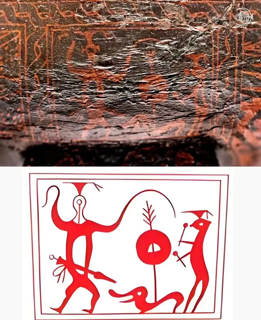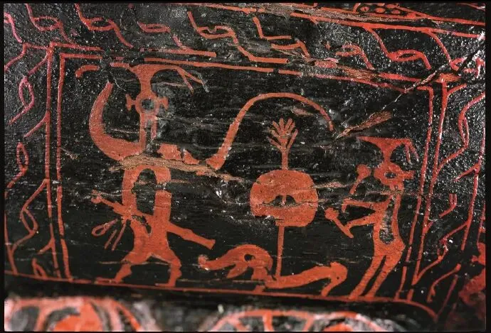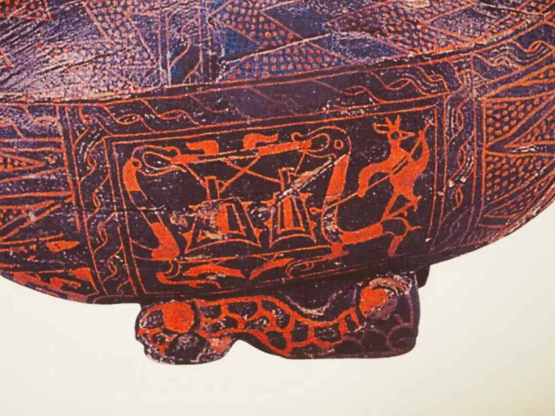 漆盒通体以黑漆为地,施以朱红、金黄等色彩绘,纹饰精美,包括鳞纹、锯齿纹、菱格纹及鸳鸯羽毛等,生动逼真。其最珍贵之处在于腹部两侧的两幅漆画,左侧绘“撞钟击磬图”:画面中,一对鸟形立柱分上下两层,上层悬挂甬钟,下层悬挂磬,旁有一似人似鸟的乐师,手持长棍撞击编钟,形象地展现了战国时期宫廷礼乐的演奏场景。右侧绘“击鼓舞蹈图”:中央立一建鼓,鼓座为兽形,一侧有兽形人物持槌击鼓,另一侧则是一位佩剑武士随鼓声翩翩起舞,展现了“长袖善舞”的先秦舞蹈美学。这些图像不仅具有极高的艺术价值,更为研究曾侯乙编钟的演奏方式提供了关键依据,因此这件漆盒被誉为曾侯乙编钟的“使用说明书”。