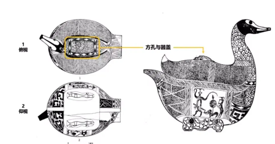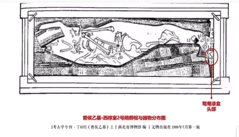战国彩绘乐舞图鸳鸯形漆盒出土于曾侯乙墓的西室,而它的头部则在西室的二号陪葬棺内被发现。这一特殊的空间分布,成为推测其主人身份的关键线索。