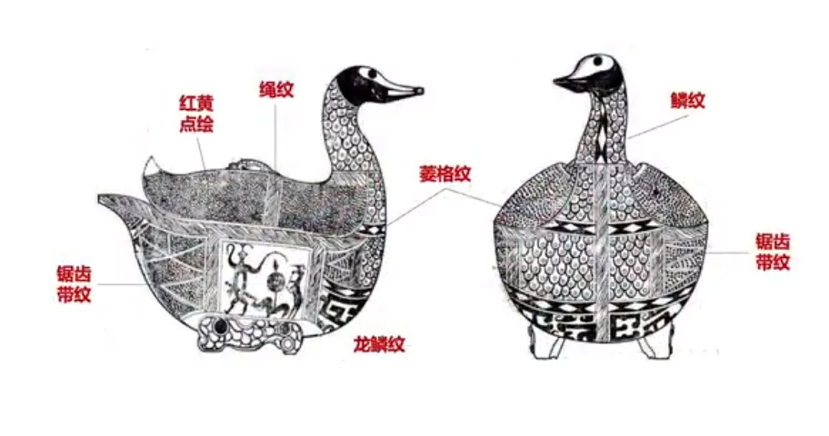 No165:战国彩绘乐舞图鸳鸯形漆盒