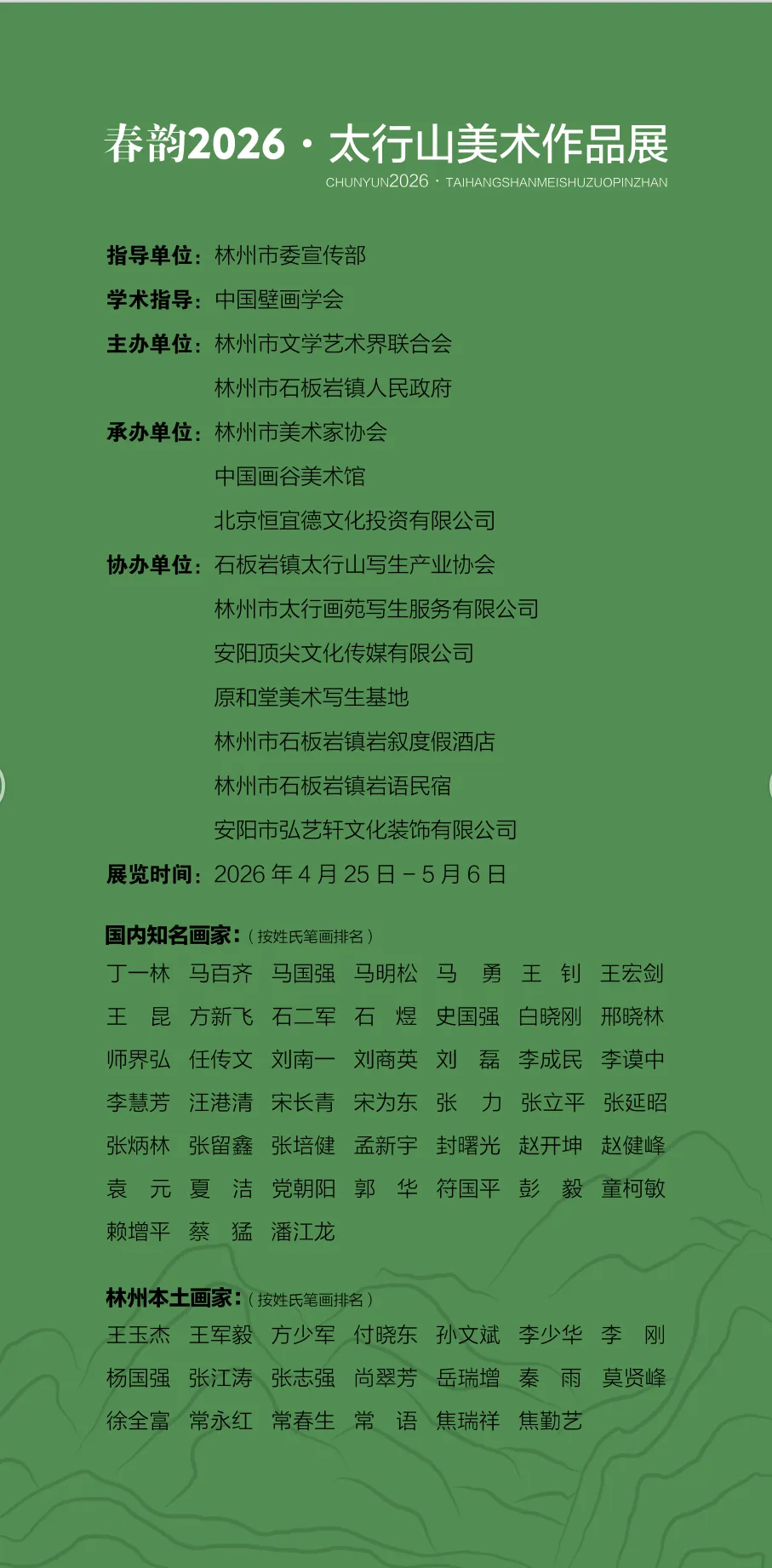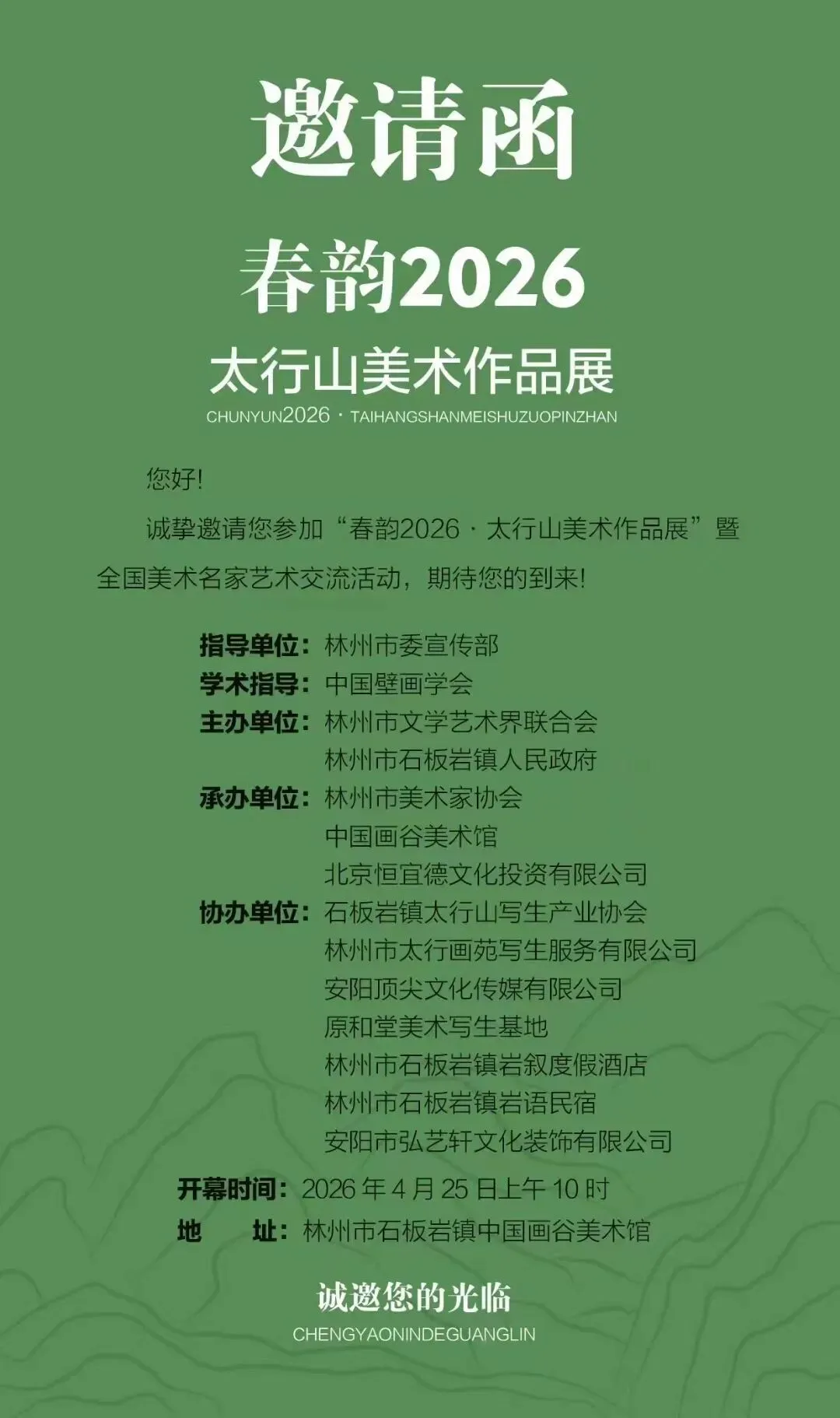 值此林州市美术家协会新一届主席团换届之际,为深入挖掘太行山自然风光与人文精神,推动林州美术事业繁荣发展,我们特于2026年春季,在石板岩中国画谷美术馆举办“春韵2026”太行山美术作品展。本次展览以林州本土画家创作为主体,同时精选全国各地画家留存于石板岩写生基地的优秀作品,汇南北笔墨、集古今意趣,以丹青为媒,以山水为韵,全方位展现太行之雄、林州之美、时代之新。