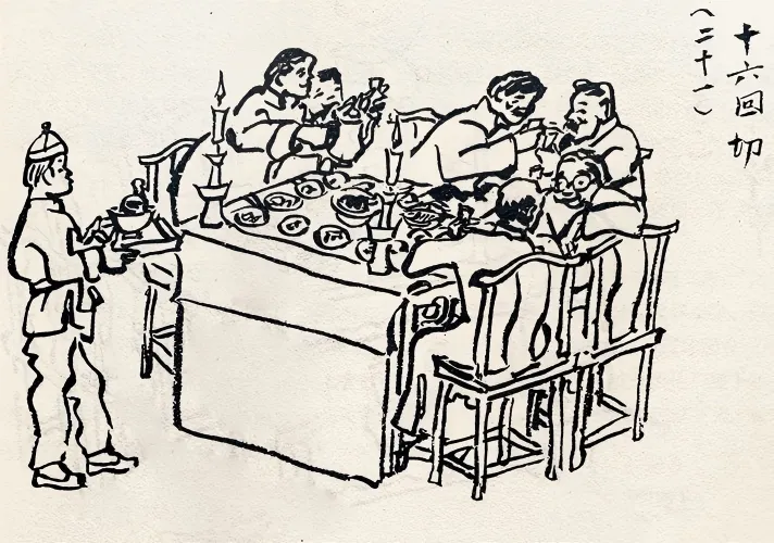 1947年,叶浅予受徐悲鸿聘请到国立北平艺术专科学校任教,开启四十年任教生涯,同时继续深耕与精进艺术创作。晚年每年回到故乡桐庐、长住“富春画苑”,完成百幅《富春人物图谱》的归乡创作。单元还展现了他与好友共同复原失传的传统酒席“十六回切”并将其绘入画中的文化记忆。“桐庐是我生命的根,身心欢乐的根,艺术源泉的根。”