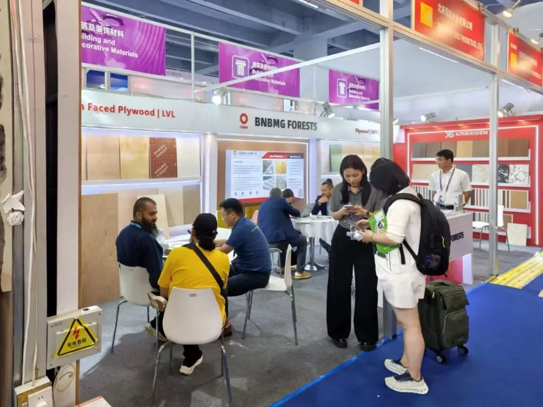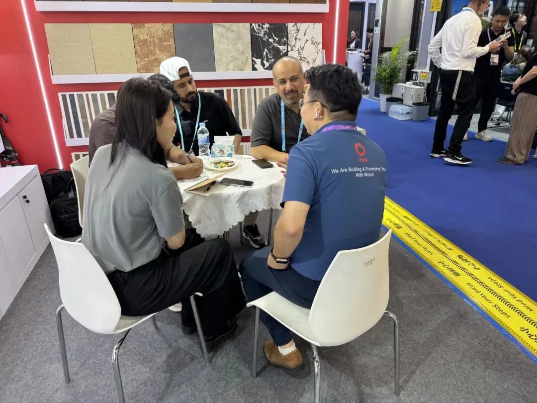 展会期间,北新木业丰富的产品吸引来自东南亚、中东、欧洲、非洲等地区的采购商驻足交流。工作人员围绕“Karrisen凯立森®”产品的环保性能、物理特性及应用场景进行专业讲解,并结合案例演示,帮助客商直观了解产品优势。其中,饰面板采用高品质环保基材,搭配PET、PP、实木皮等饰面,兼顾美观与耐用,适用于高端家居定制;OSB与刨花板结构稳定、强度高,广泛应用于家具制造和室内装修;防潮防火密度板及防滑建筑模板聚焦工程建设场景,满足海外基建与家装市场对安全性能的高标准要求。多位采购商对产品品质与创新表示认可,现场达成多项初步合作意向。