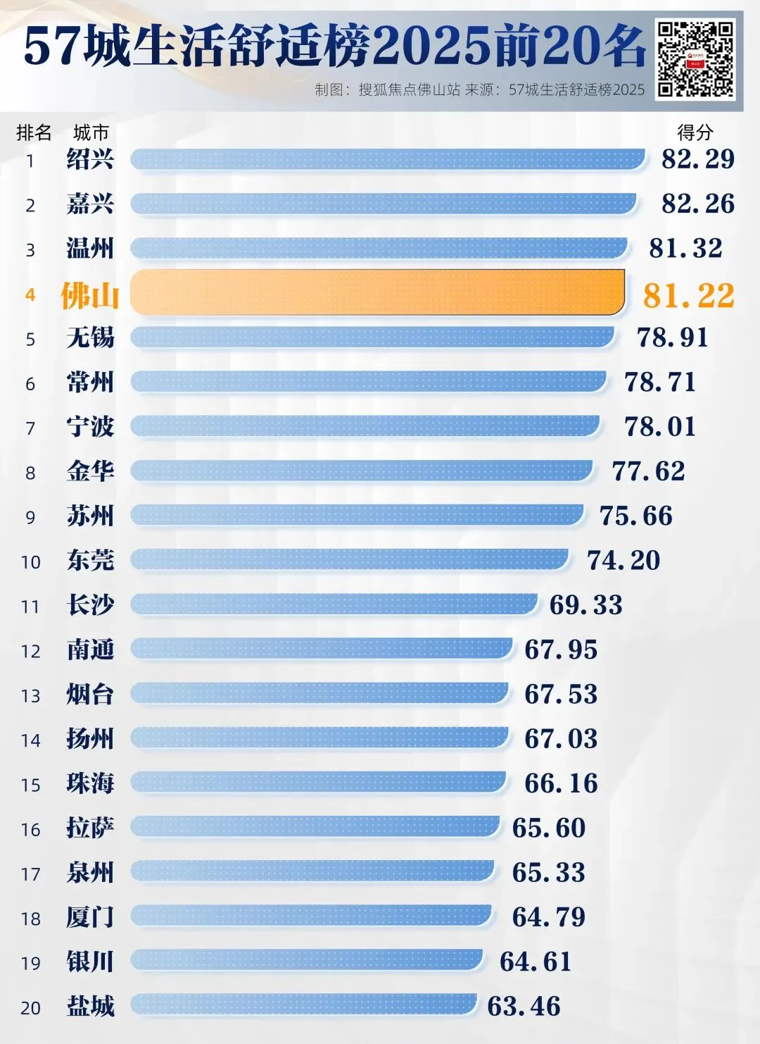 近日,《57城生活舒适榜2025》正式揭晓,佛山位居全国第四,力压一众省会与一线城市。