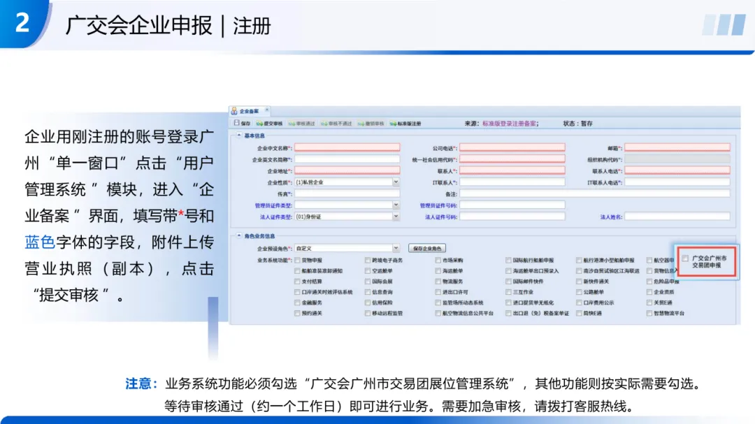 有意申请第140届广交会一般性展位的广州市企业须通过中国(广州)国际贸易单一窗口门户网站(https://gz.gd.singlewindow.cn/)完成账号注册、信息完善。若已注册广州单一窗口账号,可通过用户管理系统自行勾选“广州市交易团广交会展位申请”功能增加对应权限,有疑问请联系客服020-86010121;