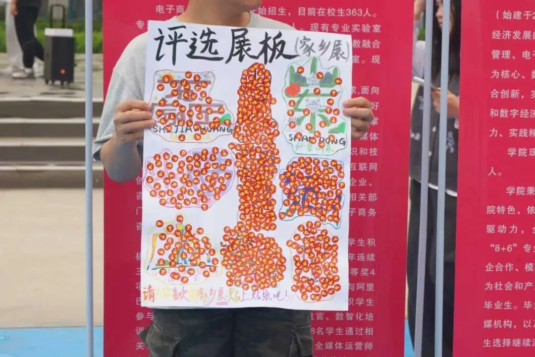 活动特别设置贴纸投票环节,大家手持专属贴纸,为自己心仪的家乡展区投出宝贵一票。一张张贴纸,既是对各地展区精心筹备的认可,也是对不同地域文化的喜爱,在互动投票中,进一步加深了同学们对各地文旅与会展资源的认知。
