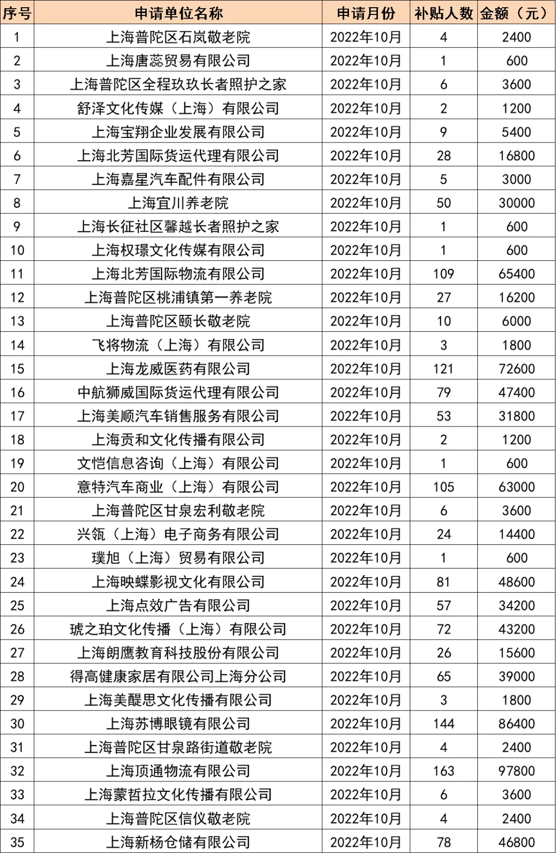 按照《关于给予本市相关用人单位就业补贴应对疫情稳岗保就业的通知》(沪人社规〔2022〕18号)的有关要求,经审核,现将对受疫情影响较大的困难行业企业给予稳就业补贴的情况进行公示,接受社会监督。公示期限:2022年10月28日至11月3日。
