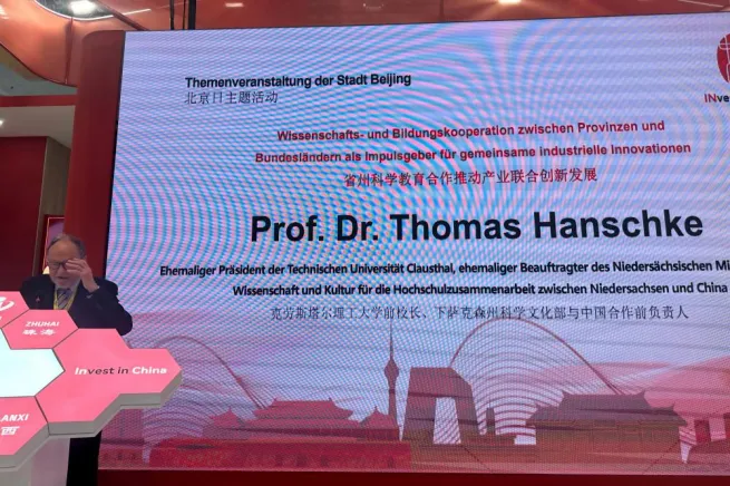 4月21日下午,在汉诺威工业博览会“Invest in China”展区(Hall 11 D70),由中国国际投资促进中心(德国)主办、中国(德国)研发创新联盟协办的“投资中国—北京两区推介活动”顺利举行。活动围绕北京两区开放合作、科技创新和产业交流展开。活动期间,克劳斯塔尔工业大学前校长、下萨克森州科学文化部与中国合作前负责人Thomas Hanschke教授发表了演讲,他以“省州科学教育合作推动产业联合创新发展”为主题,回顾了与中国长期交流的历程,强调应以乐观、尊重和务实的态度看待中德关系,并呼吁在科技、教育与产业协同中不断深化双方合作。