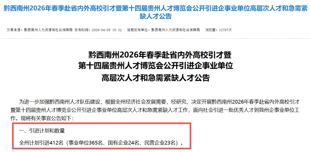 招聘人数:412人(事业单位365名、国有企业24名、民营企业23名)