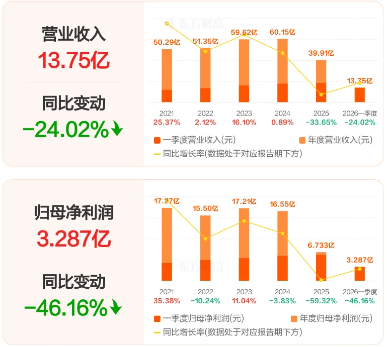 公司2025年营业收入39.91亿元,同比大幅下降33.65%;归母净利润仅为6.73亿元,同比暴跌59.32%。