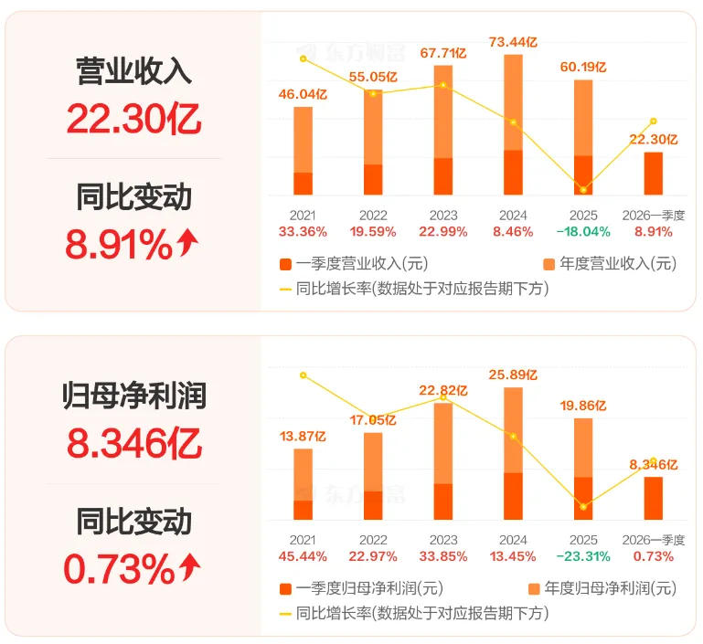 公司一季度营业收入22.30亿元,同比增长8.91%;归母净利润8.35亿元,同比增长0.73%。在白酒行业整体仍处出清筑底阶段的背景下,这一稳中略增的业绩表现被市场解读为积极信号,也成为4月23日白酒板块大涨的重要催化剂。