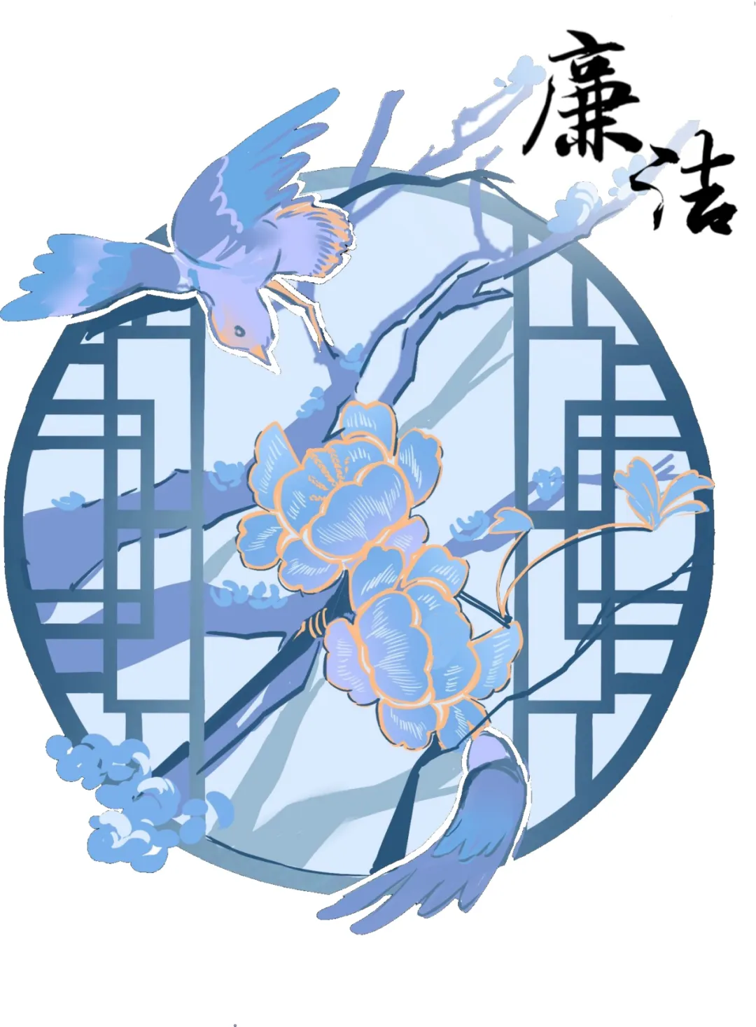 画面中的梅花傲立枝头,梅花凌霜傲雪、高洁坚韧,是廉洁与坚守自我的精神象征,展现出在纷繁世界中不为世俗污染的清正之气。飞鸟振翅高飞,寓意挣脱贪腐束缚,追求自由纯净的境界,向着廉洁的光明之处前行。