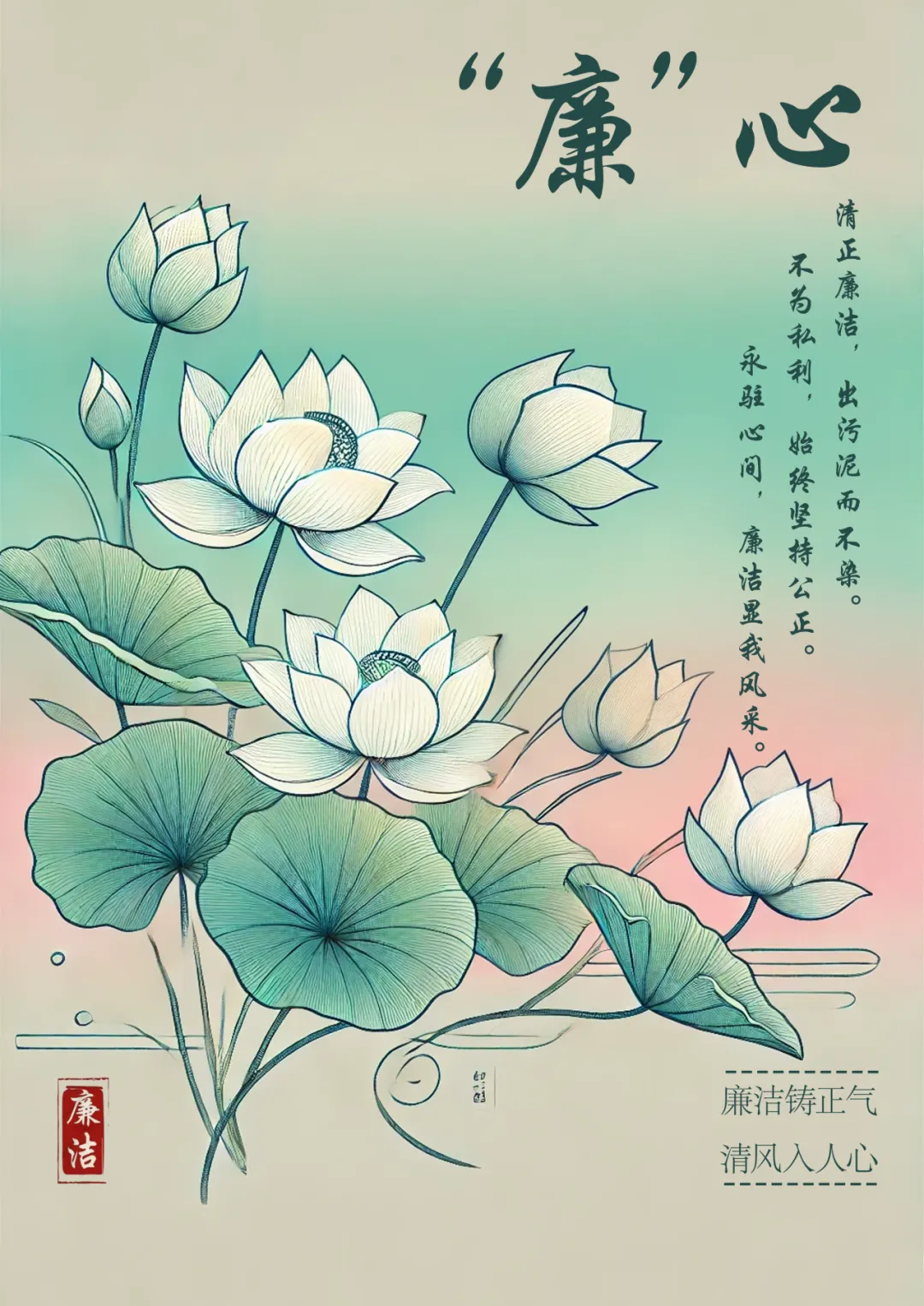 海报的色调选择了清新淡雅的水绿和粉色,传递出清风拂面的感觉,象征着廉洁之风吹进每个人的心中。荷叶的线条简洁流畅,寓意着正直和纯洁,而细腻的笔触则表达了廉洁教育的细致入微。