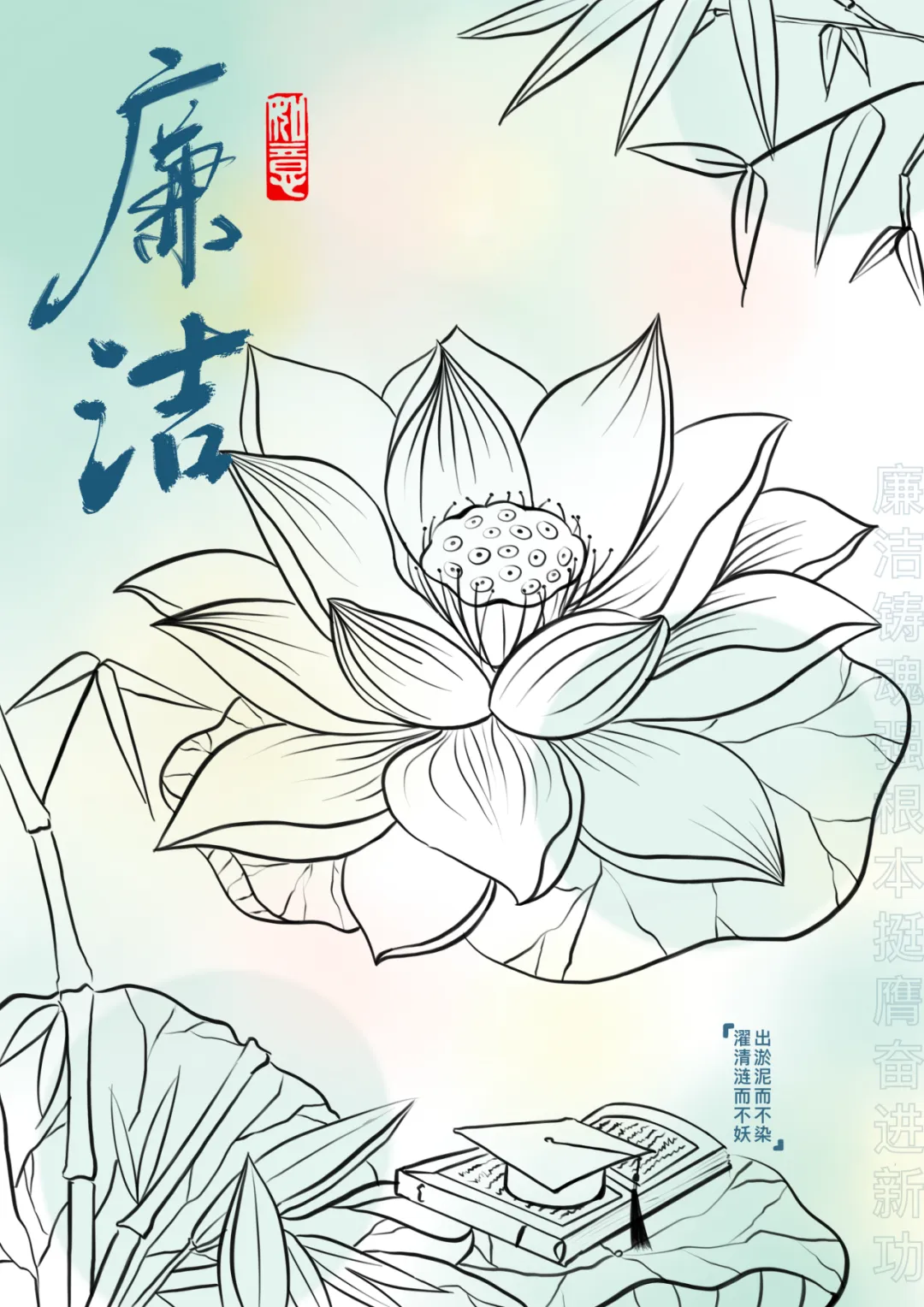 海报的设计主题围绕“廉洁铸魂强根本,挺膺奋进建新功”进行,通过传统的中国画艺术形式,表达了廉洁教育的重要性。海报中的荷花作为主要元素,寓意着“出污泥而不染”,象征着廉洁高洁的品质。荷花虽然生长在泥土中,但它保持洁净的花瓣,象征着在复杂社会环境中,个人应当保持正直、清廉的品质,追求高尚的道德修养。