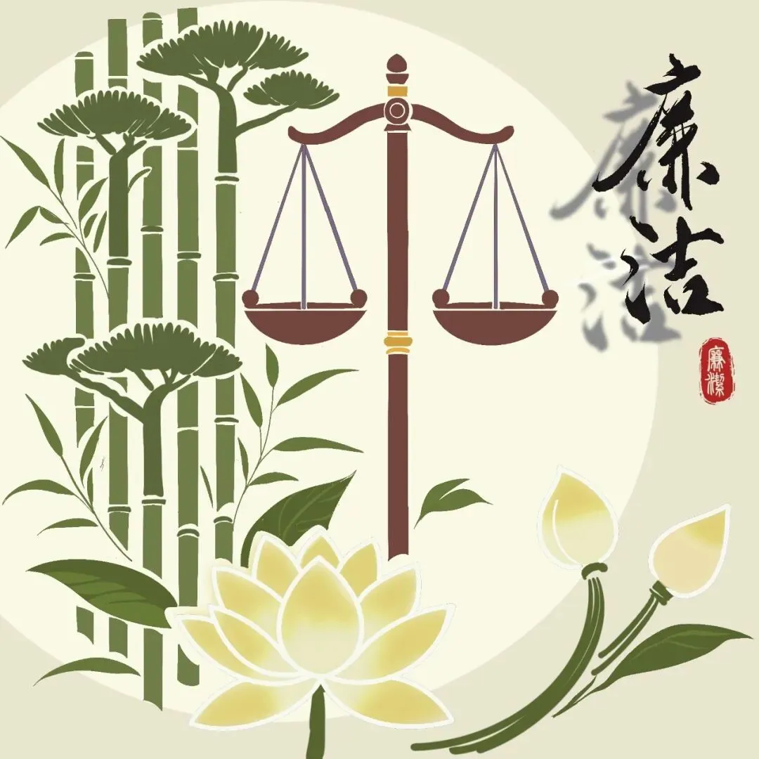 这张设计图以“廉洁”为主题,运用象征意义强烈的元素构建画面。图中包含竹子、莲花、公平秤等元素,分别寓意正直、高洁与公正,体现出廉洁自律、依法治国的核心价值。竹子挺拔不屈,象征清正廉明;莲花出淤泥而不染,寓意高尚品格与洁身自好;公平秤代表公正执法,强调法律面前人人平等。整体色调清新淡雅,传递出清廉静谧的氛围,书法“廉洁”二字与印章更增强了中华传统文化的韵味。此设计图旨在倡导廉洁文化,弘扬正气精神。