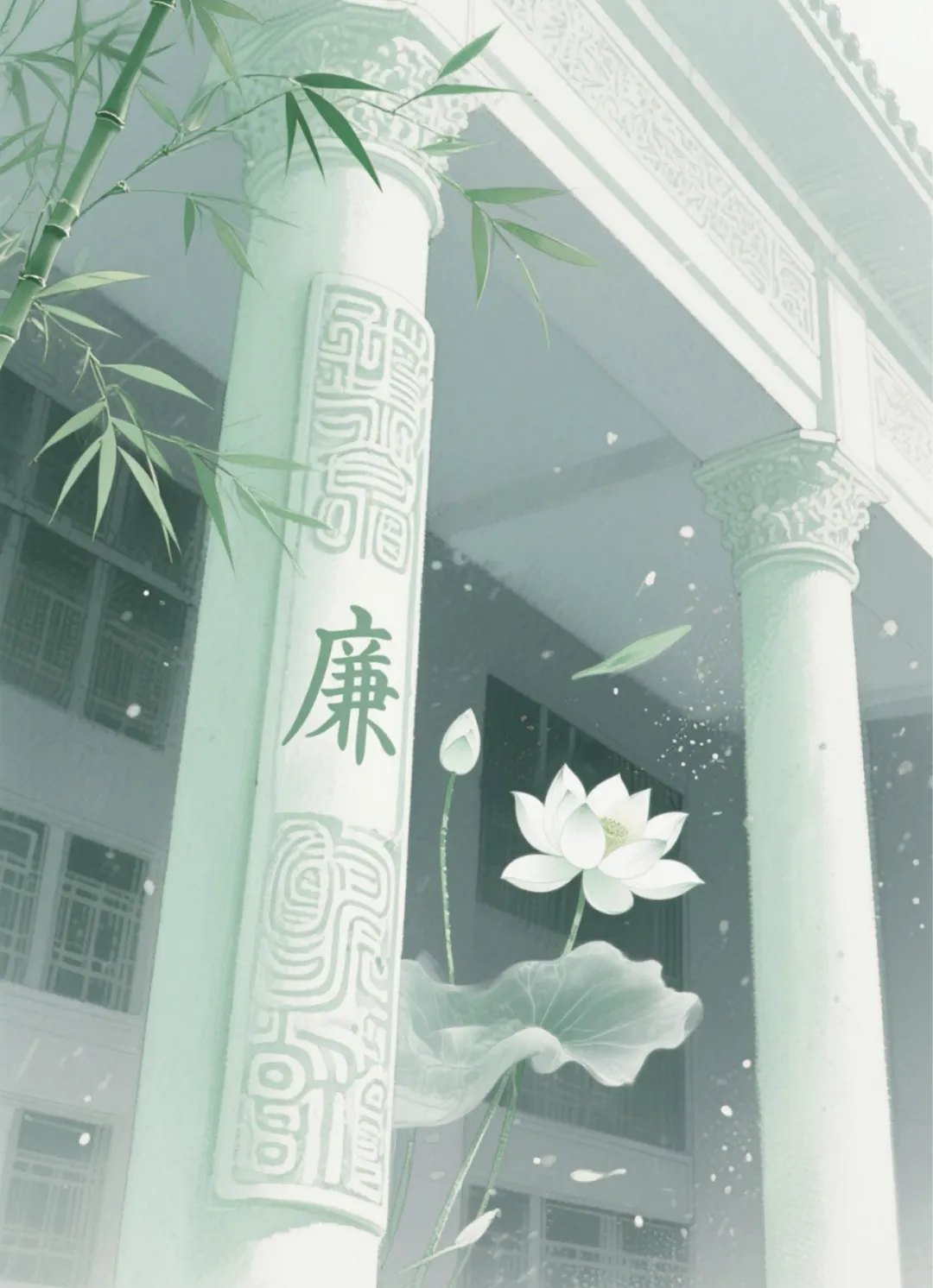 这幅作品以中国传统水墨画为风格,融合大学校园元素与“廉”文化主题。画面中的古典柱子代表校园文化积淀,空中漂浮的荷花象征纯洁高尚,契合廉洁品质;半透明竹叶寓意正直坚韧。竹竿上古朴的篆书“廉”字,强化文化韵味。浅绿色与灰色渐变背景,搭配柔和水墨飞溅,营造出静谧雅致氛围。柔和自然光的运用,在展现极简主义美学的同时,让师生于日常中受廉洁文化熏陶,实现环境育人。