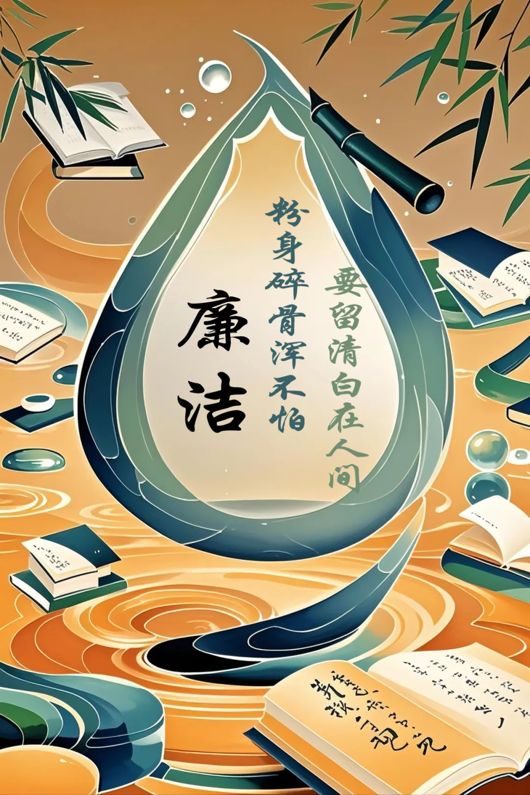 本插画以“廉洁”为主题。中心水滴造型融入 “廉洁” 二字,凸显主题。引用诗句 “粉身碎骨浑不怕,要留清白在人间” 借石灰自喻,强化廉洁坚贞内涵。
