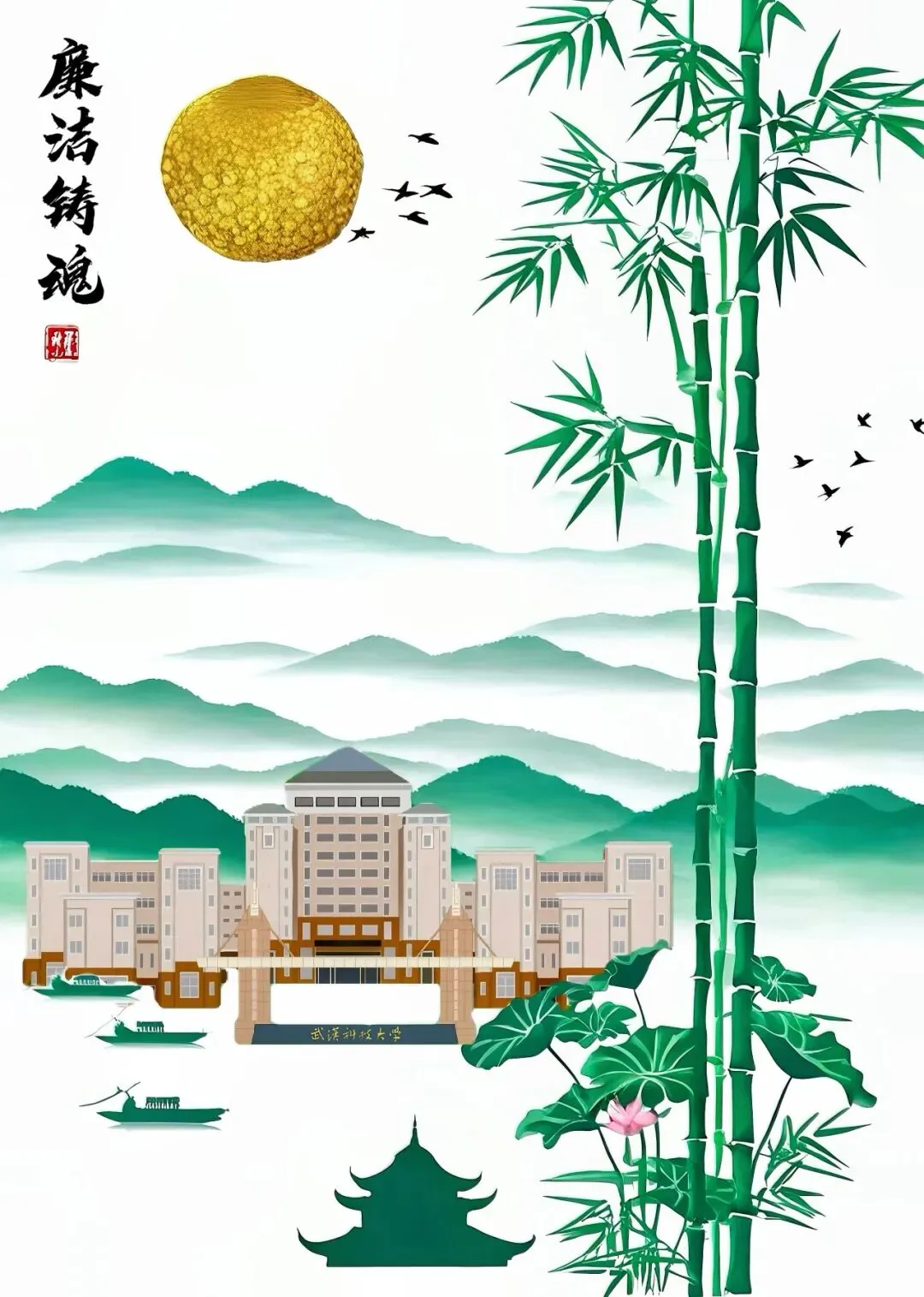 巨型青竹作为视觉锚点,左上的标题直指主题,底部盛放的莲花喻示廉洁根基,暗含党建引领。立体烫金月亮悬浮竹前形成空间层次,深绿竹纹与鎏金光泽构成强烈视觉对比。作品通过放大传统符号与现代象征的戏剧化结合,下方为武科大主要建筑图像,直观传递"廉洁铸魂”的核心要义。