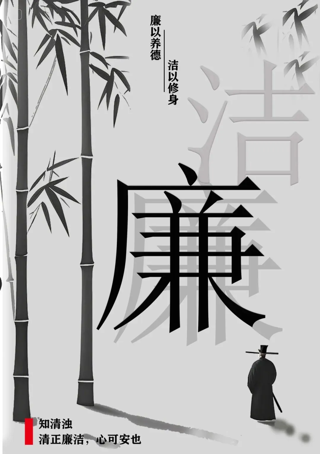 海报以“廉”为主题,通过简洁而富有意境的视觉表达,传递廉洁自律的价值观。画面左侧以竹子为主体,象征清正廉洁、坚韧不拔的品格,竹影婆娑间隐喻清风拂面,寓意廉洁如风,润物无声。中间的“廉”字采用醒目的书法字体,笔画刚劲有力,成为视觉中心,强化主题。右下角的古代人物剪影背对观众,手持竹杖,仿佛在竹林中漫步,营造出一种静谧而深邃的氛围,暗示廉洁之人淡泊名利、心安如水的境界。整体色调以黑白灰为主,简洁大方,突出廉洁的纯粹与高洁。