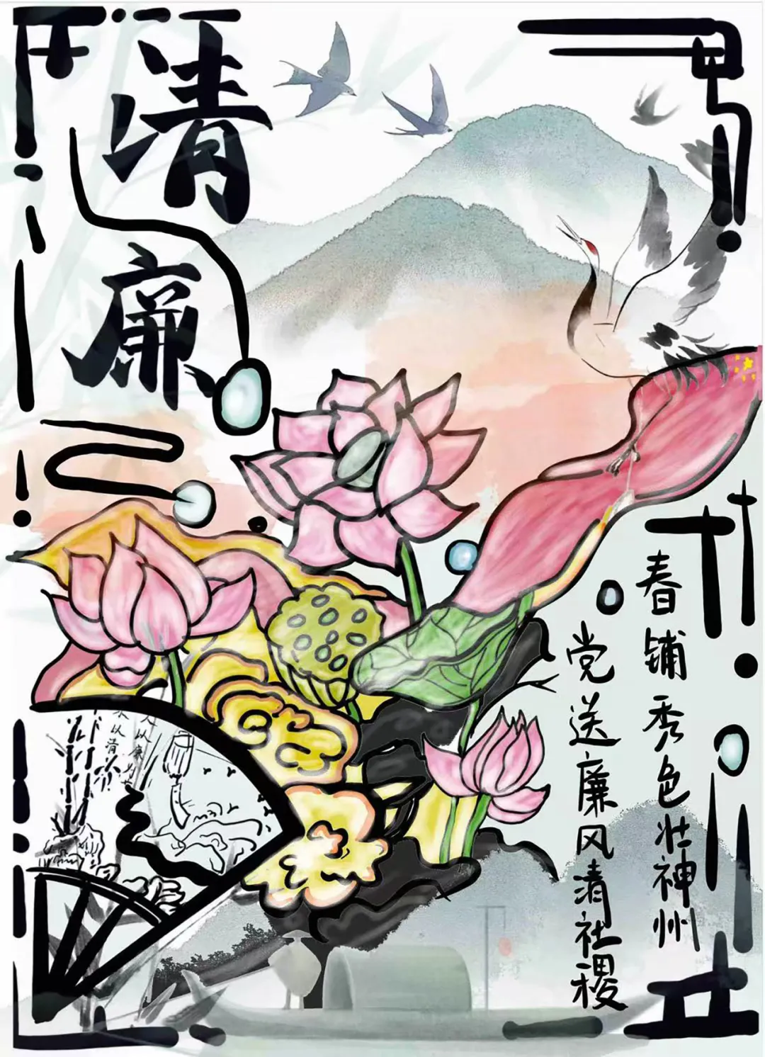 作品以“出淤泥而不染”为核心意象,通过水墨泼染技法构建层次分明的视觉空间。画面主体为飘在水面上的莲花。顶端莲花以朱砂点染,背景色彩晕染独特,象征清廉精神与家国情怀的交融。其中若隐若现的“挺膺奋进”书法字样,通过动态模糊效果形成奋进轨迹,利落的线条构成肩扛重担的抽象造型,呼应“建新功”的担当精神。画面左下角水墨涟漪,虚实相映,突显廉洁教育的文化根基。整体采用黛青与留白的对比色调,在传统文人画意境中注入现代视觉张力,传递激浊扬清的永恒主题。