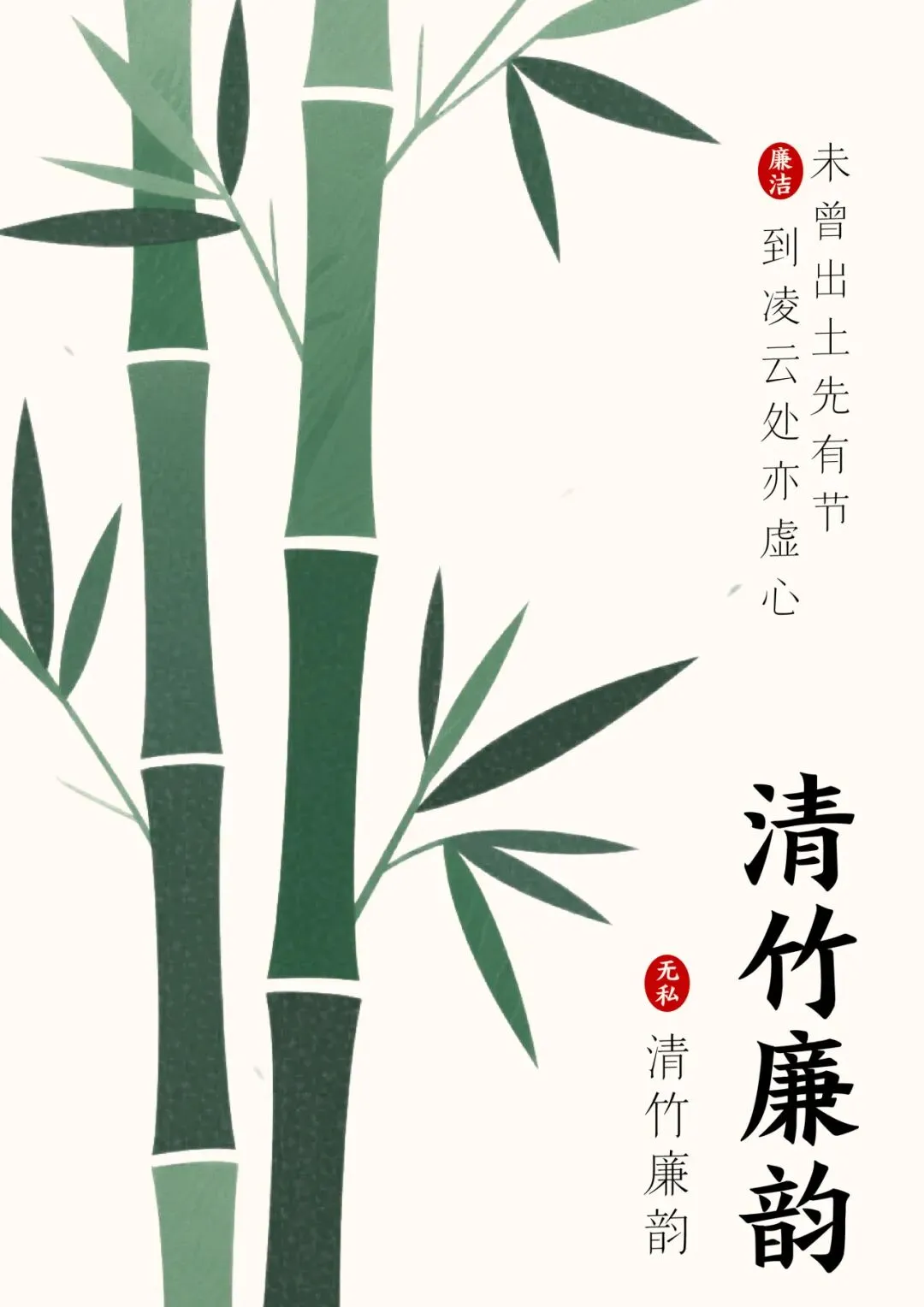 这张 “清竹廉韵” 海报,旨在以竹子为独特载体,传递廉洁精神。画面主体是几株形态优美的竹子,其翠绿的颜色清新自然,象征着生机与纯净。竹子枝节分明,展现出刚直不阿的姿态,正如文字“竹有节而直,人守廉则刚”所表达的,借竹节喻廉洁之人的气节,强调坚守原则、正直不阿的品质。