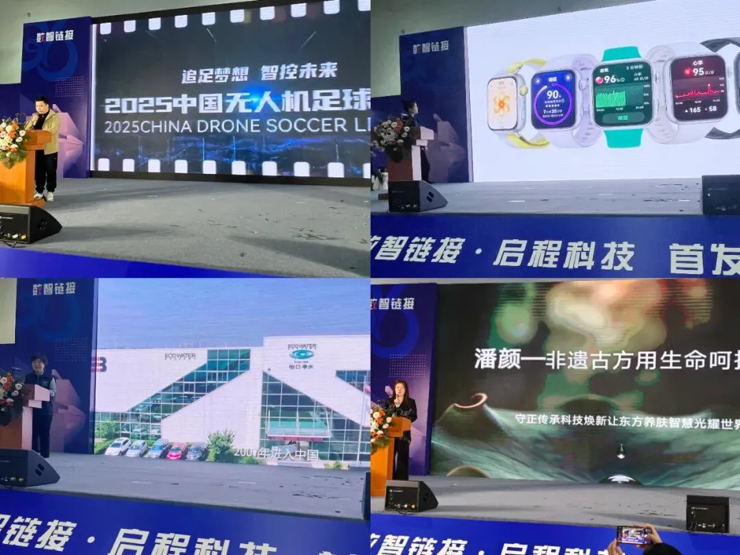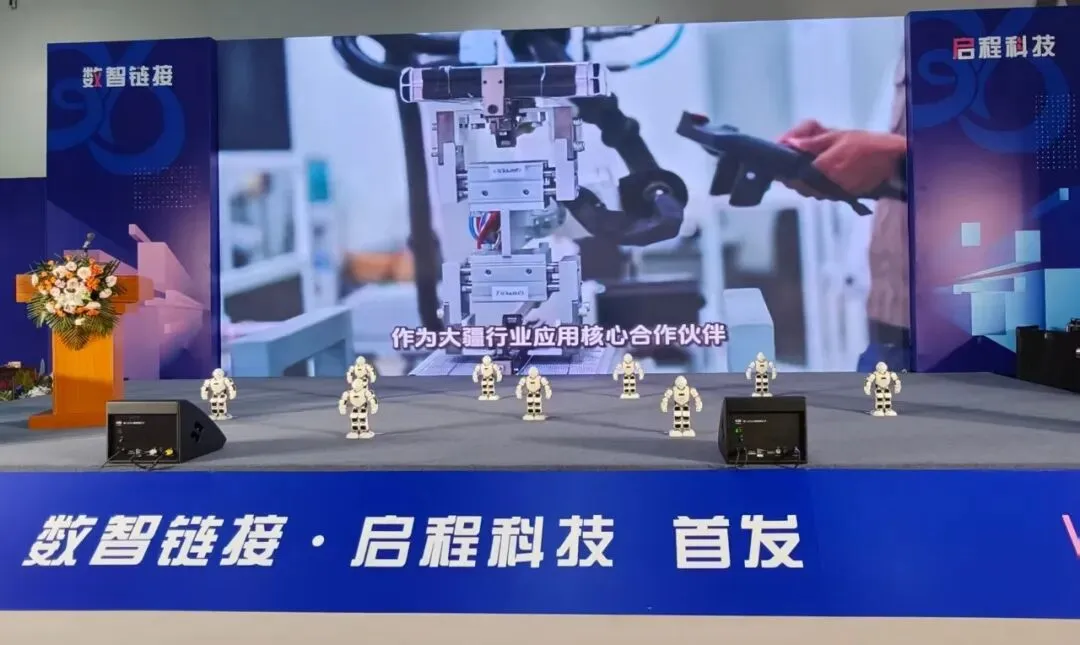 首发仪式上,来自无人机、智能机器人、数字孪生、智慧赛事系统等领域的八家科技企业分两批进行新品及解决方案宣介。开幕式环节,九台智能机器人以编队舞蹈形式完成科技开场表演,展现了运动控制与协同算法的应用能力。