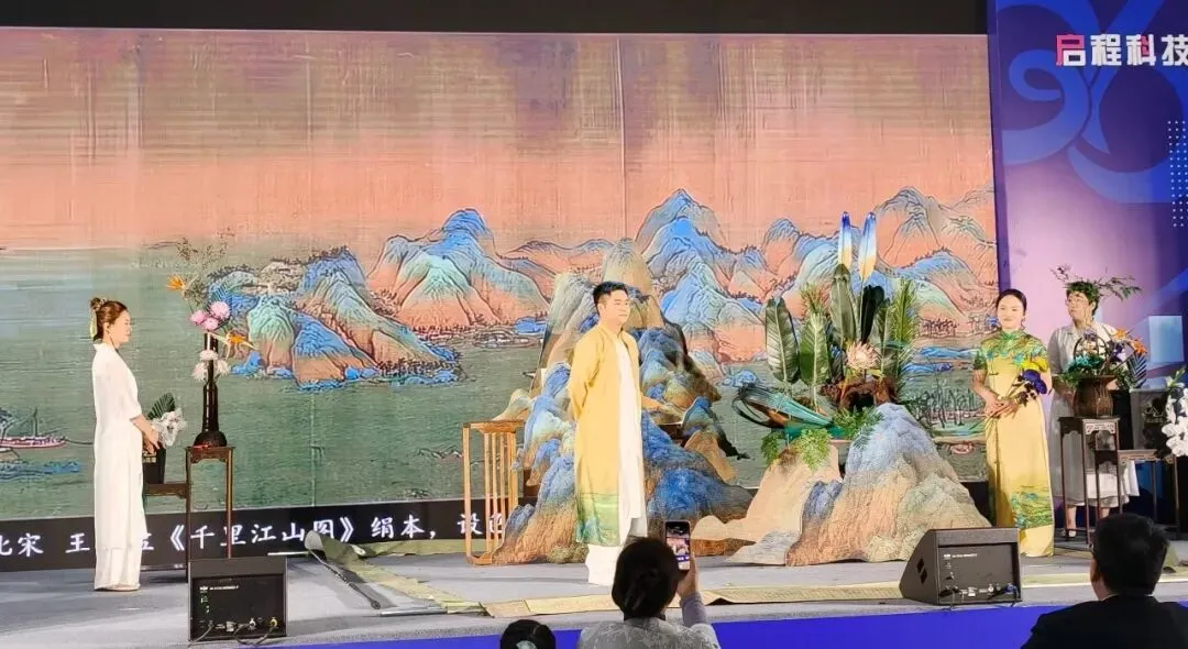 为诠释“体育+科技+文旅+经贸”融合内涵,活动特别策划了《千里江山图》主题国风插花花艺表演。在古风音乐与青绿山水画面的映衬下,花艺师现场创作主题作品,以传统美学语言呼应科技创新的时代精神,展现了大连文体旅产业对文化厚度与科技高度的双重追求。