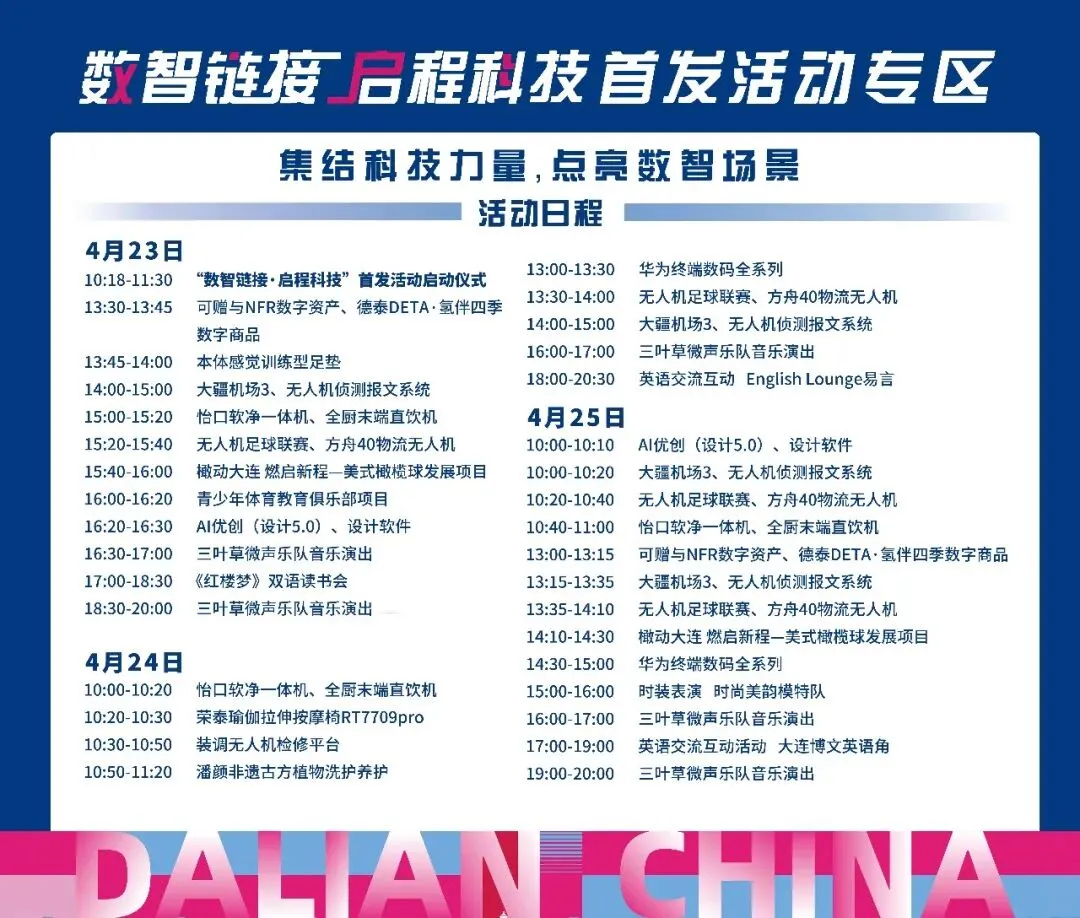 大连市特色文化产业促进会协同珂华生物科技发展(大连)有限责任公司,首发潘颜非遗古方外用纯植物洗护及养护系列产品;大连市轻工业学校与槐叙(大连)品牌管理有限公司携手集中发布本土特色花果茶酒饮品。现场共有28家企业、21个展位入驻首发活动专区,进行限产产品展示与对接。展会日程安排显示,4月23日至25日期间将连续举办多场企业产品推介会。