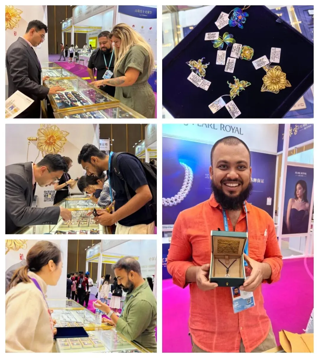开展以来,福人楼展位吸引了来自欧洲、东南亚、中东等地区的众多采购商驻足洽谈。客商们纷纷赞叹中国传统工艺的精巧,深入了解作品背后的文化内涵,多款非遗工艺首饰当场达成采购意向。