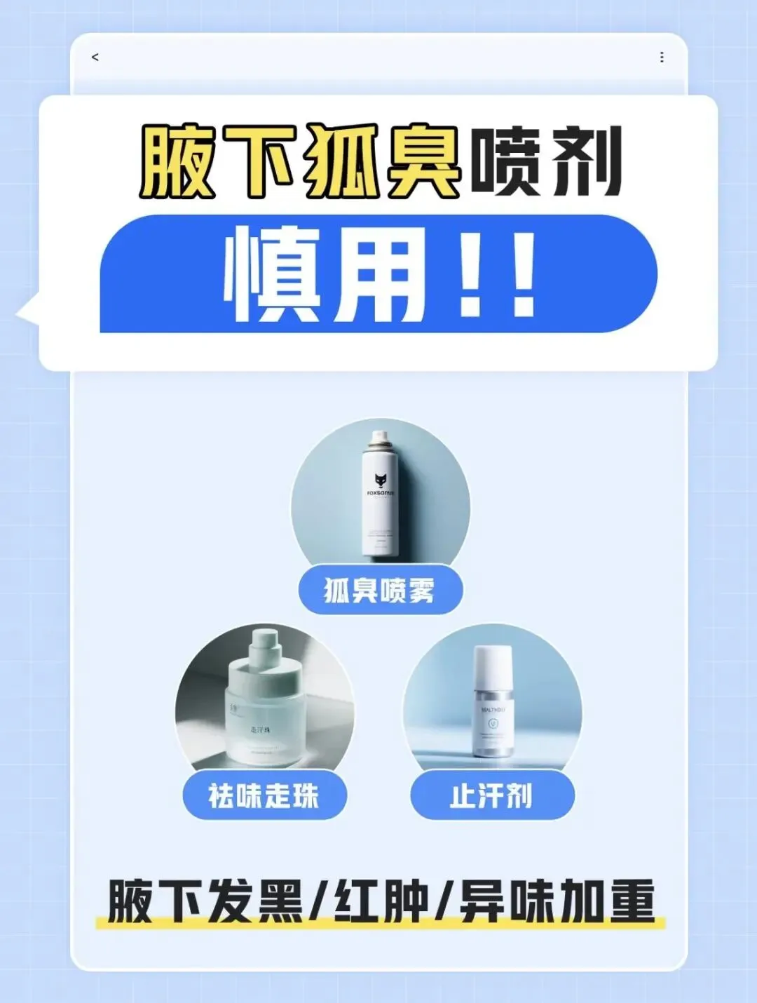 很多人一到夏天出汗多、有异味,就急着用止汗露、狐臭水、强效止汗喷雾...以为一喷就干爽,其实这些产品长期用,对皮肤真的不友好: