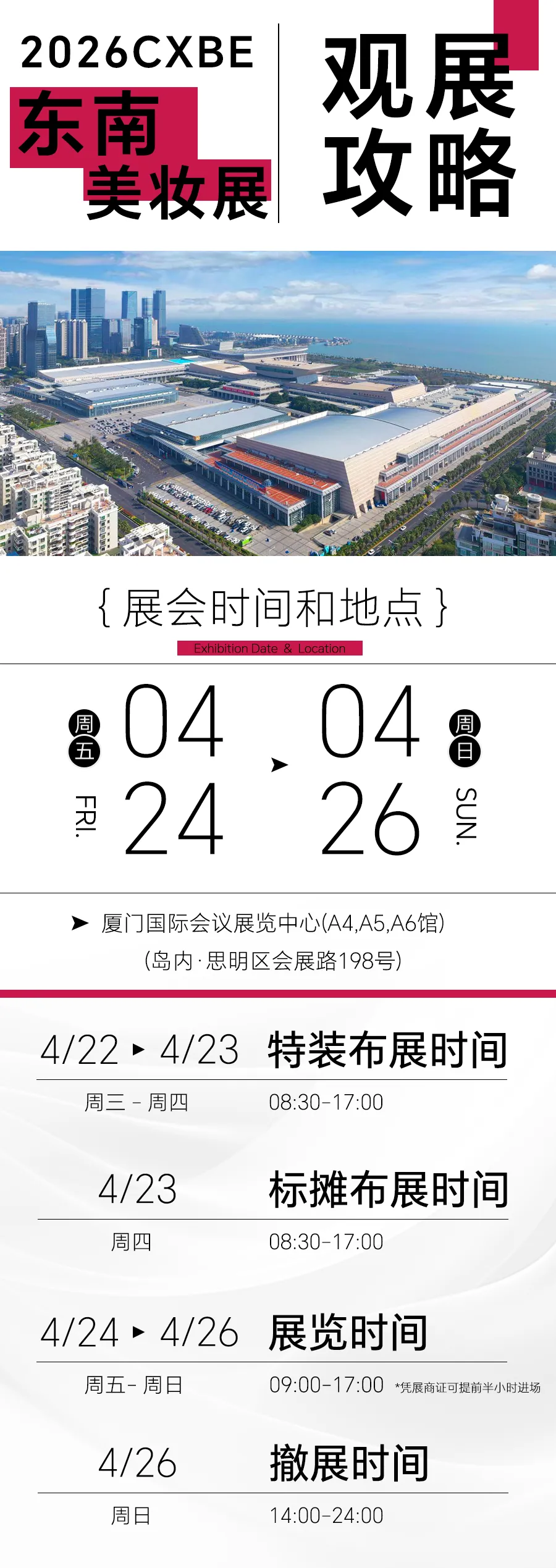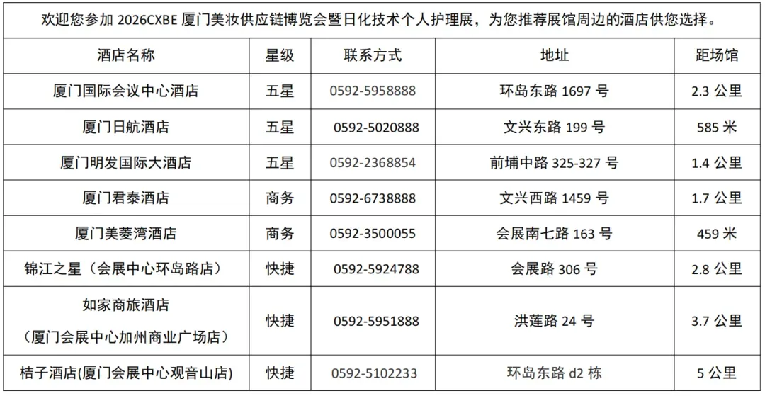 *由于在 2026CXBE 厦门美妆供应链博览会暨日化技术个人护理展期间房源紧张,请各位参展商提前订房。
