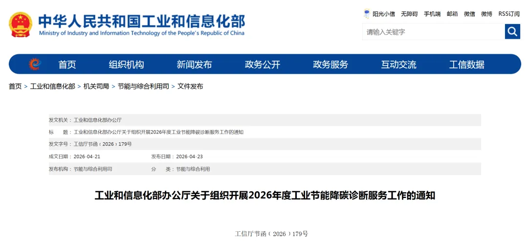 4月23日,工业和信息化部发布关于组织开展2026年度工业节能降碳诊断服务工作的通知。通知明确,聚焦钢铁、电解铝、水泥、平板玻璃、炼油、乙烯、合成氨、甲醇、聚氯乙烯、造纸、印染、算力设施、通信基站等重点行业领域,对重点企业统筹开展节能降碳诊断和碳排放核算服务,并根据诊断和核算结果,制定节能降碳改造具体方案,明确改造内容、实施路径和时间安排等。详情如下。